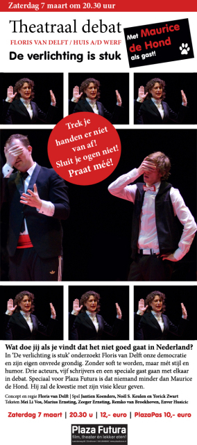Bij de Plaza Futura in Eindhoven speelt zaterdag 7 maart het theatraal debat ‘De verlichting is stuk’ van Floris van Delft/ Huis a/d Werf. In ‘De verlichting is stuk’ onderzoekt Floris van Delft onze democratie en zijn eigen onvrede. Drie acteurs, vijf schrijvers en een speciale gast (Maurice de Hond) gaan met elkaar in debat.  De verlichting is stuk – Floris van Delft Wat doe je als je vindt dat het niet goed gaat in Nederland? Als je iets móet doen, maar niet de politiek in wilt? Dan voeg je daad bij het woord en maak je een voorstelling die de democratie eens flink onder de loep neemt. _____________________________________________________ Floris van Delft onderzoekt een avond lang zijn eigen onvrede. Zonder soft te worden, maar mét stijl en graag een beetje humor. Gewapend met drie acteurs en vijf schrijvers licht hij de democratie door. Dit keer geen politiek entertainment zoals onze volksvertegenwoordigers opvoeren, maar een bijeenkomst die de inhoud niet schuwt. _____________________________________________________ 8 weekly schreef: "Democratie mag dan een thema zijn waarvoor je niet snel je bed uitkomt, maar Floris van Delft maakt er een bijzondere voorstelling over. Hij kan 'de politieke poppenkast' niet meer aanzien. De voorstelling is een bewonderenswaardig initiatief, want de Nederlandse samenleving is de laatste jaren flink in beroering, maar tot het theater is daar nog maar weinig van doorgedrongen. Met De Verlichting is stuk lijkt de theatermaker dat in één klap goed te maken." 07-03-2009 - 20.30 uur Plaza Futura Eindhoven |