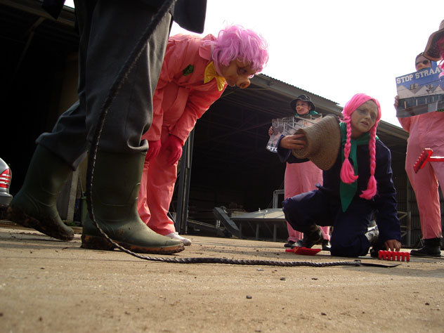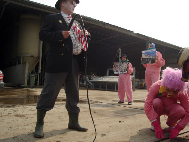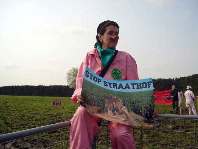 40 activisten van de groep Stop Straathof heeft vandaag een groentetuin aangelegd op het terrein in Buren waar grootindustrieel Straathof een van zijn vele varkenshouderijen wil uitbreiden. De actie was een protest tegen de dierindustrie en bij behorende sojateelt voor veevoer, die veel ellende veroorzaakt in Zuid-Amerika.  De actie begon nog even spannend omdat de politie de activisten stond op te wachten. Via een achteraf weggetje wist de actiegroep, gestoken in varkenspakken en boerenoveralls, het bedrijf toch te bereiken en kon het spitten en planten van diverse groenten en fruitboompjes toch beginnen. Een drietal werknemers werd gekalmeerd en de plaatselijke politie bleek ook al een hekel aan Straathof te hebben en liet die actievoerders hun gang gaan. Toen de noeste arbeid erop zat, trok de stoet onder begeleiding van de Rhythms of Resistance actiesambaband al flyerend via Erichem naar het stadje Buren. Het spel van Rebelact liet zien hoe het grootkapitaal dieren en boeren uitbuit. Bij de plaatselijke supermarkt en basisschool werd een kleine manifestatie gehouden met hapjes, muziek en een tentoonstelling over sojaproductie en dierindustrie. Ongeveer iedereen in Buren kent de varkenshouderij van Straathof, kent de stank die het bedrijf veroorzaakt en ziet het complex liever verdwijnen. De verspreide flyer waarop ook de problemen met de veevoerproductie en het dierenleed worden beschreven, geeft hun nog wat meer argumenten tegen Straathofs varkenshouderij en vleesproductie in het algemeen. 17 April was speciaal uitgekozen als dag voor de actie omdat het de Internationale Dag van de Boerenstrijd is. De dag is uitgeroepen door Via Campesina, een wereldwijd netwerk van organisaties van kleine boeren. Bij Erichem (gemeente Buren) wil varkensondernemer Adrianus Straathof zijn bedrijf - Knorhof genaamd - uitbreiden van 13.480 naar 19.142 varkens. De toestemming voor uitbreiding is mede afhankelijk van de Milieu Effect Rapportage, die nu bij de Provincie in behandeling is. Omwonenden proberen Straathof's uitbreidingsplannen al jaren tegen te houden. Zij zitten in de stank, terwijl Straathof zijn villa op een veilige afstand in Vuren heeft staan. Straathof heeft negen varkenshouderijen in Nederland en Duitsland. Op diverse locaties heeft hij uitbreidingsplannen en regelmatig ligt hij met gemeentes, provincies en lokale bevolking overhoop. Hij staat bekend om het overtreden van de milieuwetgeving en andere regelgeving; stallen zijn veel voller dan toegestaan, er vonden transporten plaats tijdens vervoersverboden en 'Knorpolder', zijn grote varkensbedrijf in de Noord-Oostpolder is in eerste instantie zelfs helemaal zonder vergunningen gebouwd en in gebruik genomen. De Nederlandse dierindustrie, als voornaamste afnemer van soja voor veevoer, is medeverantwoordelijk voor massale ontbossing, de verdrijving van kleine boeren van hun land en vergiftiging door pesticidegebruik in Zuid-Amerika waar de soja geteelt wordt. In Europa veroorzaakt ze dierenleed en grote uitstoot van broeikasgassen. Om het verband tussen de westerse dierindustrie en armoede en gebrek aan gezond voedsel in het Zuiden te illustreren, wordt door de actiegroep 'Stop Straathof' een groentetuin aangelegd op de locatie waar een nieuwe stal is gepland. Activist Gerben in 't Veld: “Het planten van de appelbomen en groentes is een symbolische actie om Straathof duidelijk te maken wat voor ellende in Zuid-Amerika hij op zijn geweten heeft. Maar ook in Nederland moeten we onze grond gebruiken voor een lokale duurzame voedselproductie en niet zoveel teren op importen vanuit de andere kant van de wereld.” Ook in Duitsland vinden acties plaats op een locatie waar Straathof dit jaar zijn varkensimperium wil gaan uitbreiden: gelijk met de actie in Erichem bezetten 100 mensen het stuk land bij het plaatsje Alt Tellin waar Straathof dit jaar een nieuwe varkenshouderij wil gaan bouwen. Het gaat hierbij om de bouw van een megastal voor 10.500 zeugen en 35.000 mestvarkens, de grootste stal in Europa . Voor zaterdag 18 april is er nog een breed gedragen demonstratie gepland. Op 17 april worden op vele plekken ter wereld acties gehouden ter gelegenheid van de Via Campesina Internationale Dag van Boerenstrijd. Via Campesina strijdt voor voedselsoevereiniteit, landhervorming en tegen het kapitalistische systeem van economische groei en uitbuiting. “Straathof is geen boer maar een gewetenloze ondernemer. Vandaar deze actie in solidariteit met de duizenden geslachte dieren en de kleine boeren die hun land verliezen door de Nederlandse vleesproductie”, aldus Gerben. Voor meer informatie: