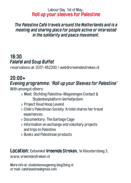 Na het grote succes van het Palestina Café in Utrecht en Leiden zal het Café nu ook Wageningen aandoen. Het Palestina Café is een grassroots initiatief van en voor individuen die solidair zijn met de Palestijnen of dit misschien willen worden. Maandelijks wordt het café in een andere plaats in Nederland gehouden. Tijdens het café worden korte presentaties gedaan, documentaires getoond en ideeën en ervaringen uitgewisseld. Doel is uitwisseling en versterken van het netwerk van mensen die zich inzetten voor het Palestijnse volk.