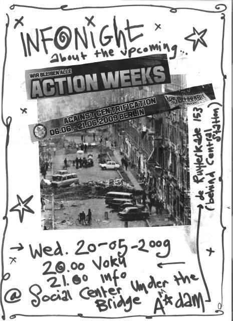 Wednesday the 20th of May there is an Info night in the SCUB, De Ruyterkade 153. The info night is about the upcoming action weeks against gentrification and for free spaces in Berlin (6th to the 21st of June 2009). Tonight!!!!!!!!!!!! Woensdag 20 Mei is er een info avond in de SCUB, De Ruyterkade 153. De info avond gaat over de komende aktie dagen in Berlijn tegen gentrificatie en voor vrijplaatsen (6 tot 21 Juni 2009). VOKU 20:00 INFO 21:00  Wednesday the 20th of May from 20:00 : an info and Voku night with comrades from Berlin about the upcoming action days there. Last year there were also action days in berlin, with many squatting actions and sponti-demos. Based on the success of this two weeks of action have been organised from the 6th to the 21st of June. There is info about the "Wir bleiben alle" free spaces campaign, its recent successes and the general situation faced by our comrades in Berlin is also given. There is also time for questions and drinking afterwards. "All friendship is political" so get your asses down to the SCUB, de Ruyterkade 153. Woensdag 20 Mei vanaf 20:00 : een info en voku avond met comrades uit berlijn over de komende aktie dagen daar. Afgelopen jaar waren er ook aktie dagen in berlijn, met veel kraak akties en sponti-demos. Gebaseerd op het succes hiervan zijn er nu twee aktie weken georganiseerd van 6 tot 21 Juni. Info gaat over de "Wir bleiben alle" vrijplaatsen campagne, haar recente successen en de algemene situatie waarmee onze comrades in Berlijn geconfronteerd worden. Na de informatie is er ook tijd voor eventuele vragen en zuipen. "Alle vriendschap is politiek" so get your asses naar de SCUB, de Ruyterkade 153. Website: http://actiondays.blogsport.de/ |