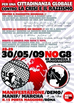 http://www.edu-factory.org/edu15/index.php?option=com_content&view=article&id=166:the-perfect-wave-10000-against-g8-charges-and-fights-into-the-red-zone&catid=34:struggles&Itemid=53 Ook bij de conferenties van de landbouwministers ((18-20 april Castelbrando) en milieuministers (22-24 Syracuse, Sicilie, zie geweldig filmpje http://www.youtube.com/watch?v=5s21oeAuII0) waren massale protesten. Ondertussen is ook de staatsrepressie ouderwets op gang gekomen en worden er de gebruikelijke alarmerende berichten via de media verspreid over vernielzuchtige hordes die er aan zitten te komen. Na sabotageacties tegen een gentechtentoonstelling bij de landbouwtop, werden meerder huizen van actievoerders in Treviso binnengevallen en leeggehaald, evenals het sociale centrum Ubik-Lab. Om onbekende redenen heeft Berlusconi ook Balkenende uitgenodigd voor de top http://www.nu.nl/economie/1964126/berlusconi-nodigt-nederland-uit-voor-de-g8.html Bij de G20 was deze ook al present. Het Schengen-akkoord (waarin bepaalde EU-landen hun grenzen openstellen voor burgers uit andere EU-landen) zal vanaf 25 juni opgeschort worden. http://www.omroepbrabant.nl/anp.aspx?id=150509535 Na de verlegging van Sardinië (waar al een anti-G8 overleg op gang gekomen was) naar L'Aquila komen langzaam de voorbereidingen op gang om demonstraties en acties te organiseren. De omstandigheden zijn zwaar, met Berlusconi aan de macht en op lokaal vlak soms openlijk fascistische bestuurders. Een herhaling van 'Genua' wordt gevreesd, toen de politie de vrije hand had gekregen om demonstranten het ziekenhuis in te slaan. Toch zijn ook de linkse bewegingen de laatste maanden sterk in kracht gegroeid, mede door de 'anomalous wave' van studenten en jongeren die zich verzetten tegen hervorming en commercialisering van het onderwijs. Komend weekend (28-30 mei) is er in Rome een conferentie van de G8 over 'migratie en veiligheid' http://nog8roma.wordpress.com/ (engels) http://www.gipfelsoli.org/Home/L_Aquila_2009/7138.html Zie voor een enorme lijst links, filmpjes en websites het Duitstalige artikel op Gipfelsoli http://gipfelsoli.org/Home/L_Aquila_2009/6946.html Een eerste oproep om de G8 in L'aquila te 'begraven' was deze: http://www.radicaleyes.it/ filmpje: http://www.youtube.com/watch?v=ade1NsG64Q4 Italiaanse websites: http://abruzzo.indymedia.org/
