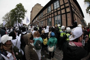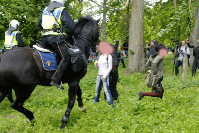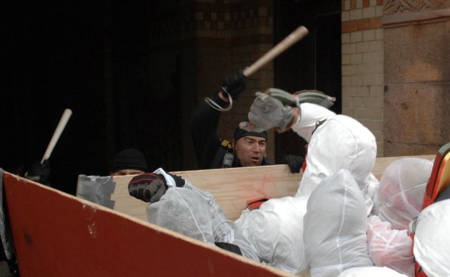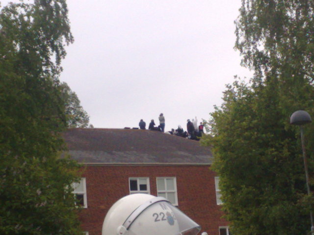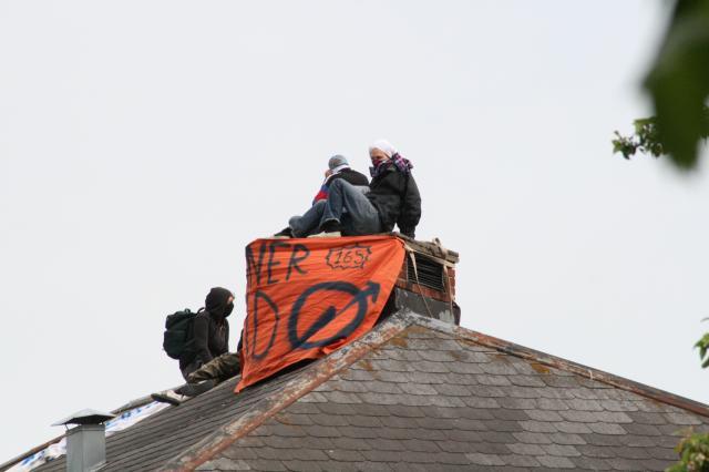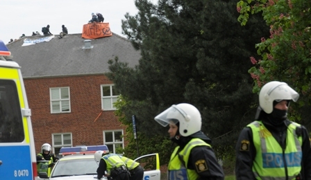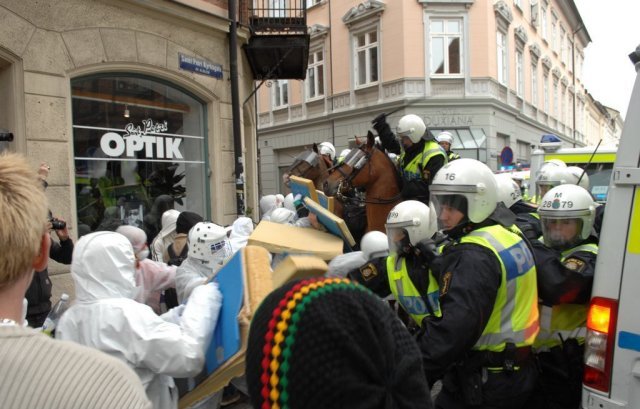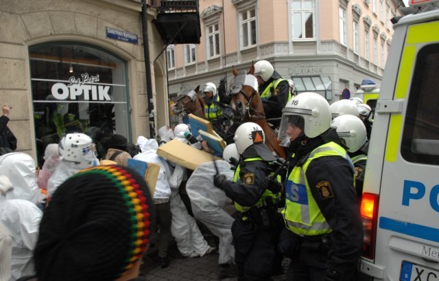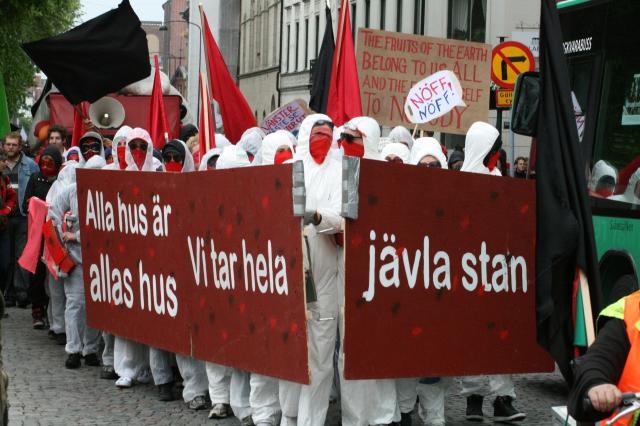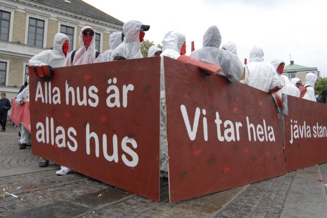 More than 1000 people took part in a squatting festival in the small swedish town of Lund, during a weekend filled with music, party, food and mass attempts to enter houses. Pressing through or evading the police lines the squatters, dressed in different colors and protective padding, managed to squat 2 houses in 6 tries while confronting horses, pepper spray and beatings from the police.                    Report from squatting festival in Lund, Sweden 16-17 may Background ------------- For many years in Sweden, squatting houses has been something not attempted very often, a lot because of the no-tolerance laws and practice by the Swedish state. The attempts during the last 15-20 years met heavy sentences and the interest in squatting sank to a low level. After the eviction of Ungdomshuset in Copenhagen many were inspired by the resistance and the movement that arose around the fight for a youth house, and the idea started to seem more real again. During the international squat days of action in April 2008 several houses were squatted in many Swedish cities, purposely during a limited time to make public activities. The temporary squattings continued after the action days and in the October 2008 a house in Lund was squatted, later called "smultronstället" which lasted for about a month. It was publicly squatted and the squatters intended to live there as long as possible. As it happened the housing situation in Sweden in general was going towards an extreme level compared to the comfortable existence most people took for granted after years of social democratic rule in the supposed model society. Lund, a small town mainly based around its university, had reached a very difficult housing situation especially for young people from the area. It was even harder for them to find a flat than for students moving there from other towns. They quickly gained a big and broad support among neighbors and the people from town with their open and inviting attitude and many came by to visit. The local media also portrayed the whole thing surprisingly good. Negotiations were started with the municipality that hadn't dared to give the eviction order yet as they were blamed for the housing politics. But after weeks of meetings and promises from the side of the politicians the squat was evicted without any notice before. The night of the eviction a big demonstration was held through the city center and shortly after, two new houses were squatted, though they were evicted the same day. Tired of the lies and backstabbing from the local politicians, the occupiers decided to make a big festival to squat new houses in the town center in a mass action, inspired the similar G13 in Copenhagen. So as the 16th of may got closer, people from many other Swedish towns had been invited and preparations were made. The plan was for 3 main blocks in different colors to squat one house each. The locations of the houses were to be kept secret until the same day and it was agreed to keep to a line of confrontative non-violence and not to negotiate with neither police nor politicians. Saturday 16/5: ----------------- A few hundred people started gathering at the main square in Lund around 14:00. There where bands playing, speeches, music, food and in general a great mood. Many wore white overalls and the 4 different blocks had their own colors. The aim for people in the 3 blocks dressed in red, green and white was to attempt to squat one house each and the blue block was for supporters that wanted a low level of confrontation. Only about 300 m after the demo started, it reached the first house the green block was aiming for. Carrying ladders behind the front banner, the green broke out to the right in a crossing and started rushing towards the entrance to the yard by the house. Most of them passed a line of horse cops by clapping and screaming to scare the horses back, but were later closed in by the horses. In the yard some of them climbed up a ladder trying to enter the house through a window, there was some struggle as the cops got up to the roof. About 20 people were caught and held by civil cops in the yard but some managed to escape through the back door of a restaurant, back to the street. Out in the street the cops started to close off the entrance to the yard and make lines to keep the other blocks out. Smoke and firecrackers were thrown against the horses which gave the cops problems to control them. Meanwhile on the other side of the corner the red block blocked the street from the cops and tried to storm into the yard through another gate with big shields held by 4 people, but were blocked by a line of cops in the doorway. The attempt to push through the line in the gate was stopped when the cops beat the ones in the front with pepper spray and truncheon blows to heads and legs. One person was hit unconscious and was taken to the hospital with concussion. After some confusion and as the cops started to kettle the remaining 2 blocks from both sides and after some waiting there was a break out attempt by the white block, now pretty mixed up, in the opposite direction. One of the bigger shields was taken by the pigs but with the smaller padded shields in a line, around 150 managed to get through the pig line that started using massive amounts of pepper spray against the crowd. The breakout group ran out to a park and got to the goal for the white block - an old abandoned observatory, and a ladder was put up and a window that was smashed in. One person got into the house and a second was on the way in as the civil cops dragged the person out (who cut up an arm on the glass). In the confusion 2 cops fell into a hole by the side of the house and one of them broke his foot climbing up. It turned out to be the leader cop of the eviction of "Smultronstället", Per Grahn - a well known ugly face in Lund who was caught on camera as it all happened and a video was put on youtube. 26 people were arrested, and the main demo was