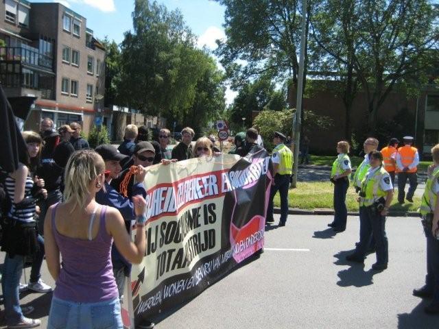 Bewoners van spoorloos hebben al sinds begin van kraak gezegd geen harddrugs in hun pandje te willen, ook niet op feestjes. En omdat ze voor wat wel of niet harddrugs zou zijn zich niet slechts laten leiden door wat de wet hier op dit moment onder vind vallen..., hebben ze gesteld dat ook sterke drank onder harde drugs valt. En dat ze dat niet willen hebben. Maar laten we het niet groter maken dan het is, er zijn hier nog nooit echt problemen over geweest. Mensen laten het thuis of weten het goed te verbergen! | | Demo achter de rug | Kraakgroep Emmen - 13.06.2009 19:34