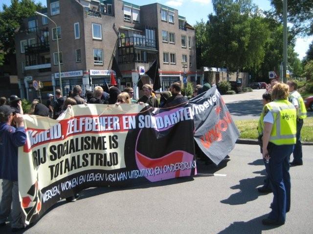 Zo'n 50 man hebben meegelopen met de demo. Een oldtimer tractor trok de geluidskar waar keihard tekno uit dreunde. Op den duur toen de groep een door smeris ongewenste afslag wilde maken zijn er zeker acht smeriswagens bijgekomen. Met ongekende repressie werd de groep feestende mensen getracht in bedwang te houden en terug naar het voorverzamelpunt te brengen. Er zijn uit protest tegen dit machtsvertoon enkele malen drukke verkeerskruispunten bezet voor enige tijd. Het was een feestelijke, strijdbare demo met een hoop ongenode gasten. Zelfs na afloop van de demo werden individuele activisten constant gevolgd door agenten. Bedankt, knokploeg van de staat, voor het tonen van het repressieniveau in Emmen. E-Mail: huizespoorloos@gmail.com Website: http://www.huizespoorloos.org | |
