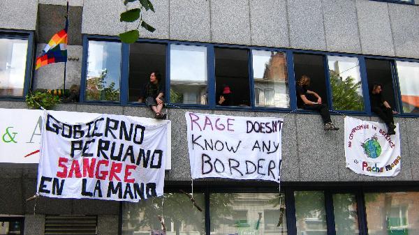 Als respons op de bezetting van inheems gebied door een gemilitariseerde politiemacht in het amazonegebied van Peru bezetten activisten het Gentse cunsulaat.