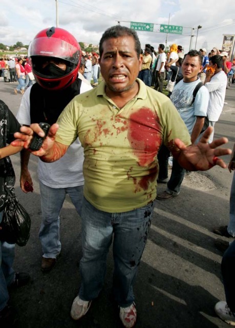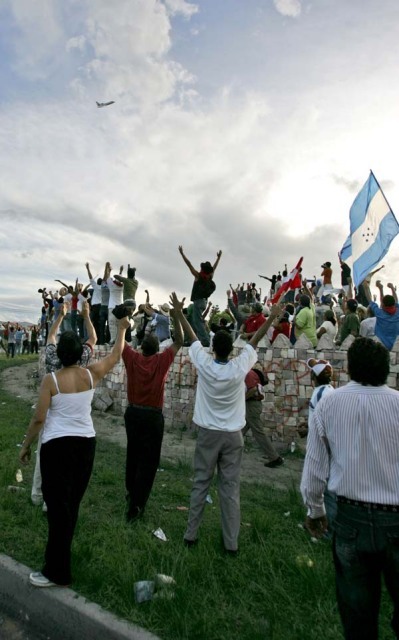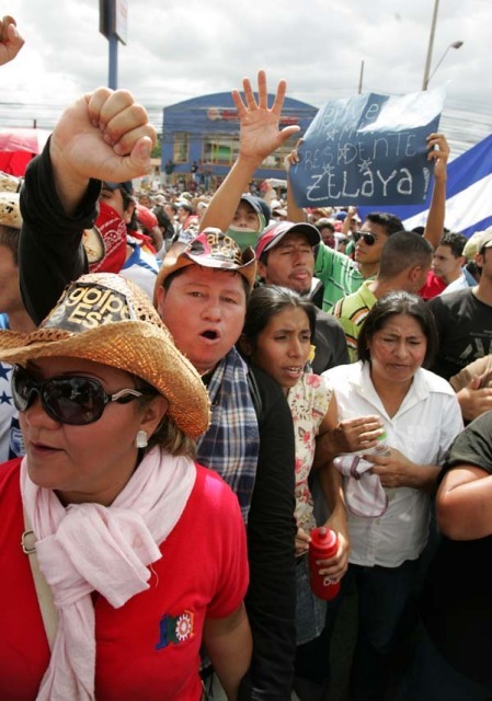 Honduras: coupplegers verhinderen terugkeer legitieme regering, tenminste twee doden onder demonstranten    Dramatische taferelen afgelopen zondag rond het vliegveld van de Hondurese hoofdstad Tegucigalpa. Tienduizenden mensen waren naar het vliegveld getrokken om de terugkeer van de door een coup afgezette linkse president Zelaya te ondersteunen. Eenheden van het Hondurese leger hadden het vliegveld bezet en voorkwamen dat het vliegtuig met de president kon landen. De demonstranten werden met geweld buiten de hekken gehouden, waarbij met traangas en later ook met scherp geschoten werd. Demonstranten belaagden de militairen op hun beurt met een hagel aan stenen. Tenminste twee demonstranten werden door militairen doodgeschoten. Zie filmbeelden en nadere info op BBC: