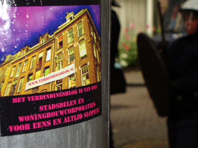 PERSBERICHT 7-7-2009 Alweer een ontruimingsronde voor leegstand en afbraak sociale initiatieven. Vandaag worden er weer vele panden en plekken ontruimd tijdens de periodieke ontruimingsronde. Panden die een belangrijke functie hebben in het kader van de sociale woonstrijd en/of vanwege het creëren van eigen autonome leefplekken. Wederom kiezen de autoriteiten (gemeente, justitie en politie) de kant van de speculanten en het snelle gewin boven sociale en menselijke waarden. Naast dat bijvoorbeeld het SCUB (social centre under the brigde) wordt ontruimd voor leegstand, de Molukkenstraat in Oost waarbij daar een woningbouwcorporatie zich niet zo nauw aantrekt van huurrechten van bewoners, de havenloodsen aan de Zeeburgerkade moeten wijken voor een yuppenenclave, wordt ook het Verbindingsblok in de Pijp ontruimd. Daar moeten sociale woningbouw woningen plaats maken voor dure koopappartementen. In bijna alle gevallen spelen hier woningcorporaties voor de nieuwe speculanten op de woningmarkt, waarbij ze de panden die ze jaren geleden voor een dubbeltje hebben gekregen verkwanselen voor het grote geld. Onze wijk de Pijp is een sprekend voorbeeld van deze yuppificering en gentrificering van stedelijke gebieden. Al jaren volgt er plan op plan om meer sociale woningen te splitsen en te verkopen, of te slopen om daar dure nieuwbouw voor in de plaats te plempen. De eigen wetten van de overheid worden daarbij gebroken, zodat zij altijd aan het langste eind trekken en desnoods met de troepen van de staat (smeris), mensen tot ontruiming en verhuizing te dwingen. En overal springen bedrijven op, vooral de huidige woningbouwcorporaties, om een graantje mee te pikken. Ze laten panden verkrotten, dan uit ‘noodzaak’ slopen en tenslotte bouwen ze weer een stapel dure appartementen. Het Verbindingsblok van woningbouwcorporatie Eigen Haard is een sprekend voorbeeld. Wonen is een basisbehoefte en is net zo noodzakelijk als dagelijks eten en drinken, en hoort bij een vrij leven waarin je zelf bepaald hoe en waarvoor je leeft. Er bestaat echter een bepaald recht huizen te bezitten, ermee te speculeren en over de ruggen van mensen grof geld te verdienen. De bezitter interesseert zich niet voor het welzijn van zijn medemens en de huurders van de woning. Daarbij weet de huiseigenaar zich gesteund door het overheidsbeleid, die door eenzijdige differentiatie van hele wijken, mensen zonder bezit en zonder centen gedwongen laat verhuizen. Menig bewoner van onze wijk, er geboren en getogen, wordt gedwongen plots tegen eigen wil zijn sociale omgeving te verlaten en plaats te maken voor de eeuwige yup, die denkt dat alles te koop is. Heel de sociale cohesie van wijken gaat op de schop en het einde lijkt nog niet in zicht. Vooral nu men het zotte plan heeft bedacht om sociale huurwoningen nu ook voor het dubbele (of meer) aan huur aan te gaan bieden. Jaren lang hebben we directe actie gevoerd en we zullen dat blijven doen, alles om onze levens en leefomgeving in eigen handen te hebben en houden. We zijn bezig met wat er leeft en speelt in de wijk, wat er moet gebeuren om de sociale banden in de wijk niet uit elkaar te rukken en de boel asociaal te yuppificeren. We nemen de leegstaande ruimte in om op een autonome manier te kunnen leven, actie te ondernemen en verzet te realiseren. Het SCUB, de Bakkerblokken, het Verbindingsblok, SWOMP 3 etc; het maakt niet uit hoe die panden of die projecten heten. Het gaat om het grote verhaal achter de panden, om de sociale (woon-)strijd. Hoe het verzet eruit zal zien, dat is voor de autoriteiten de vraag. En ook na deze ontruimingsgolf blijven we doorgaan en kiezen we onze eigen momenten om de confrontatie aan te gaan. We doen niet aan polderen, we kiezen voor de verrassing. Kraakgroep de Pijp Meer info: www.molli.nl/index.php?id=639 (Communique Kraakgroep de Pijp) en: www.swomp.wordpress.com www.verbindingsblok.nl