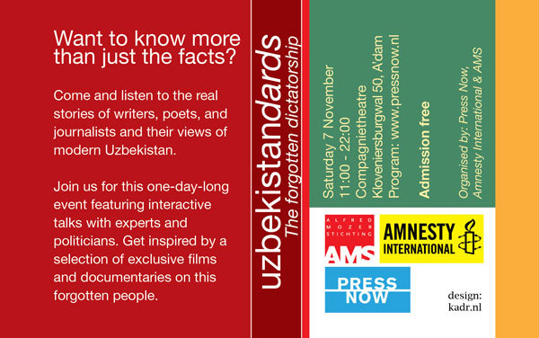 Deze hele dag staat in het teken van het regime van President Karimov in Oezbekistan. Vluchtelingen, journalisten, wetenschappers, schrijvers en politici zullen allemaal hun licht op dit vergeten land laten schijnen en hun expertise delen. Ook zijn er films over o.a. katoen en kinderarbeid, het bloedbad in Andijan en mensenrechtenactivisten in Oezbekistan.      uzbekistandards The forgotten dictatorship Uzbekistan is a country of double standards. Lying between the Caucasus and China, its impressive landscape, its beautiful historical sites and rich cultural traditions - formed during periods of Turko-Persian, Islamic, Mongolian and Russian dominance - go hand in hand with the present-day authoritarian regime of President Karimov. During his twenty year rule, child labour, torture, disappearances and media censorship have flourished. Beyond attention to the country for strategic interests such as large gas reserves, military bases and the access it provides to Afghanistan, Uzbekistan is largely ignored by the rest of the world. Did you for instance know that cotton from Uzbekistan is some of the best there is? Did you know that young children are employed to pick the cotton for the t-shirt you may be wearing? On Saturday 7 November we want to offer you a window on Uzbekistan. Writers, poets and journalists will light your way with their inspiration and real life stories. Round table discussions and lively talk shows with Dutch politicians and experts will provide an opportunity to ask questions and get answers on this forgotten dictatorship. For the first time ever in the Netherlands, a mini Uzbek film festival takes place. An exclusive selection of films and documentaries will be shown non-stop. Also, there will be a photo exhibition and a collection of Central Asian products, music and books. Join us for this ONE DAY EVENT! When: Saturday 7 November 2009 Time: 11:00 – 22:00 Compagnietheatre. Kloveniersburgwal 50, Amsterdam – Admission Free Please register & check on line for the full program at www.pressnow.nl Organisers: Press Now, Amnesty International, Alfred Mozer Stichting (AMS), Hivos, Environmental Justice Foundation (EJF) PS: Volunteers to help us on the day are welcome! You can send an email to: event7november@gmail.com. Facebook group: http://www.facebook.com/group.php?gid=135932584344 Facebook event: http://www.facebook.com/event.php?eid=155510209672 Twitter: http://twitter.com/uzbekistandards Youtube: http://www.youtube.com/uzbekistandards Flickr: http://www.flickr.com/photos/uzbekistandards Website: http://www.pressnow.nl |