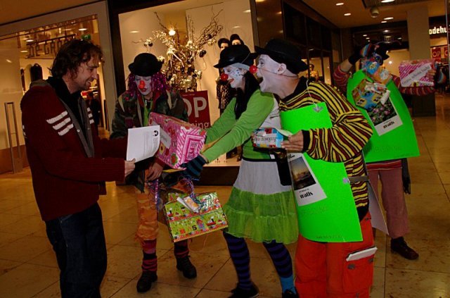 Het uitdelen ging vlot, jong en oud kreeg dan ook een kadootje, maar de beveiligers van het kopen vonden het allemaal maar weer niets, en de clowns werden grofhandig naar buiten geworpen. | | Fotos 3 | Fotoclown - 01.12.2009 04:55