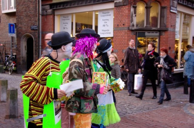 Op zaterdag 28-11 was het niet winkeldag en de clowns besloten het winkelend publiek te helpen om niets te kopen deze dag. Op zaterdag 28-11 was het niet winkeldag en de clowns besloten het winkelend publiek te helpen om niets te kopen door gratis geluk uit te delen en gratis schone lucht en gratis tijd voor elkaar en gratis een goed gesprek en gratis zonsondergang en gratis zonsopgang en gratis nou ja eigenlijk alles. Maar ook waardebonnen met tijd om met vrienden te koken en hardop te zingen op straat en de warmte van je bed als je moe bent en ziek. Nou ja en eigenlijk vonden de mensen dat heel leuk, soms was het voor de clowns wat lastig de cadootjes weg te geven en kregen ze wat ruzie onderling omdat ze zelf zo graag de cadootjes wilden hebben, maar al snel kregen ze dan door dat het toch om het publiek ging. We mochten heel lang spelen maar op een gegeven moment kwamen er 2 breed beschouderde handhavers van het consumentenpaleis aan die, niet gehinderd door enig juridische grondslag, vonden dat we lang genoeg zonder hun expliciete toestemming gespeeld hadden en hebben ons vervolgens geheel passend bij hun stijl het heilige consumentenpaleis uitgeknikkerd. Wij als clowns vonden het een erg geslaagde aktie, omdat we toch een aantal treurige en gestreste mensen even weer iets gelukkiger hebben kunnen maken. Zie ook het persbericht hieronder: PERSBERICHT Utrecht, 26 november 2009 CLOWNS GEVEN GRATIS GELUK WEG Tijdens internationale Niet Winkel Dag op 28 november a.s. Clowns van het Clownlijk Loslopend Nederlands Leger (CloLoNeL) gaan aankomende zaterdag, 28 november, diverse gratis behoeften uitdelen. Het gaat om behoeften als aandacht, geluk, liefde, schone lucht, een mooi moment en noem maar op. De clowns zijn van mening dat door de koopverslaving, mensen chronisch te kort zijn gekomen aan deze producten, die volop te krijgen zijn en nog gratis zijn ook. Aanstaande zaterdag zal internationaal aandacht gevraagd worden voor deze koopverslaving. CloLoNeL zal in de middag haar steentje bijdragen op diverse lokaties in de binnenstad van Utrecht. CloLoNeL maakt zich ernstig zorgen om de mens binnen de rijke Westerse cultuur. "Het is opvallend hoeveel mensen ongelukkig en verdrietig zijn", aldus clown Castagne. "Dit lijkt alleen maar erger te worden. Hoe meer geld wordt uitgegeven aan producten die de mens eigenlijk helemaal niet nodig heeft, hoe ongelukkiger men wordt", vervolgt zij. Clown Laaf vult haar aan: "We hopen zaterdag enkele mensen net iets gelukkiger te maken met het uitdelen van onze cadeaus en waardebonnen voor gratis behoeften." Elk jaar vinden er op de laatste zaterdag van november over de hele wereld acties plaats in het kader van internationale Buy Nothing Day. Op deze dag, bewust gekozen vlak voor de feestdagen, wordt wereldwijd aandacht gevraagd voor de gevolgen van het koopgedrag en de hebzucht van mensen in met name rijke Westerse landen. Zie daarvoor de website: