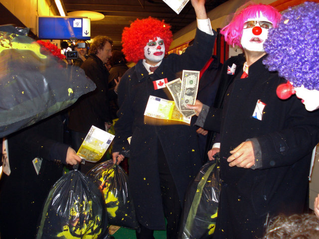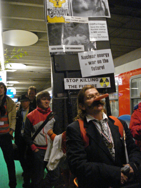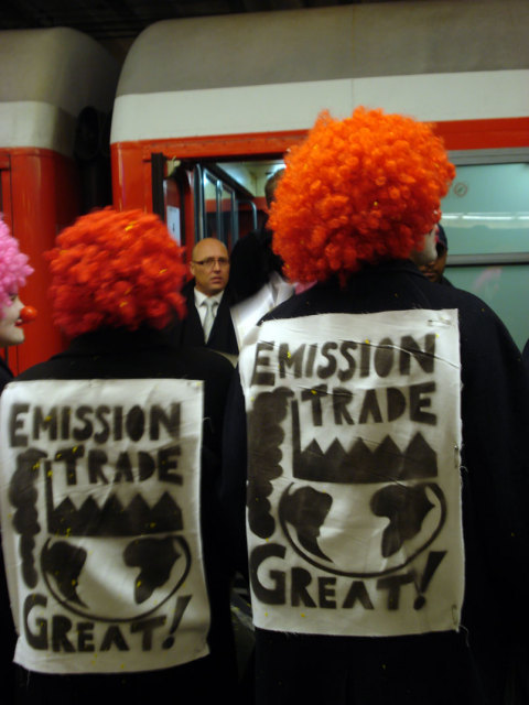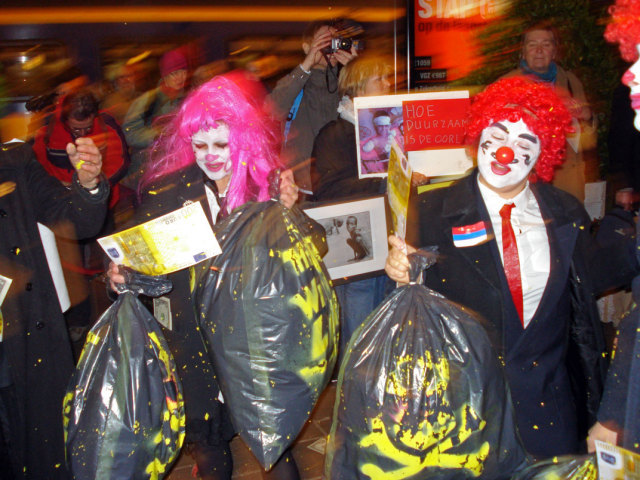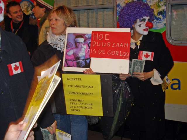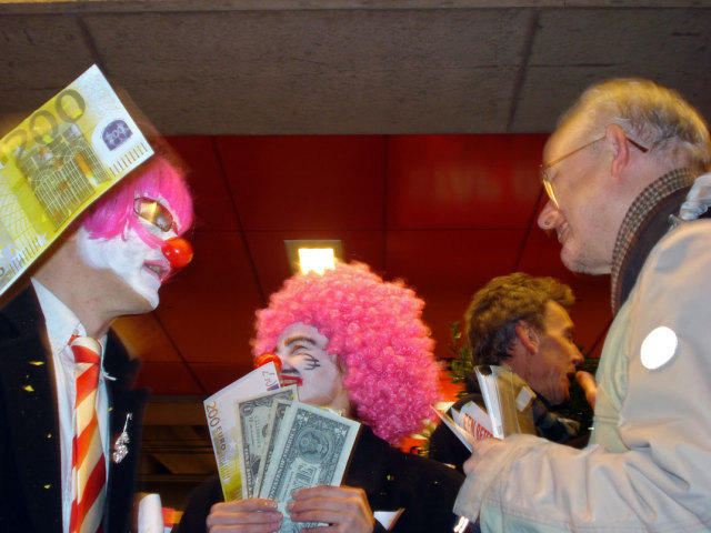 Really wonderful: an event called "Beat the Heat Now" on Saturday, Dec. 12th in Utrecht with support of trade unions, WWF, Oxfam Novib, Dutch Railways, Eneco, Spits and many more. With performances from Candy Dulfer, Ruud de Wild, Kasper van Kooten, etc. And with the minister of the Environment and Spatial Planning Jacqueline Cramer. Everything was going allright till... Till rebel clowns were entering. Around 20.15 clown business men arrived at the strip near the east entrance of the Jaarbeurs exhibition centre. There the clowns met the minister and also mayor Aleid Wolfsen and many more who were on their way to the train station. There the Copenhagen Express should bring them them to COP15, the Climate Change Conference in Denmark. Jacqueline Cramer was really friendly: she received some money from the clowns and also a small plastic bag (with the text "Keep the Netherlands clean!!!") to put in her toxic waste and a form to send it to one of the countries in the south. For sure she could use the clown money to have good business deals with developing countries. We are talking about carbon offset. Emission trade is really great! As clowns we love that crazy system - to be more clear: we love tricks! - it's absolutely fantastic! With some money there is no problem: "Pollution is the Solution!". We were lucky: after our nice talks with the minister, we could join her procession, entered the Central Station of Utrecht and walked together to the platform where the Copenhagen Express should leave. As special guests we walked the red, sorry - no, it was a green carpet (common people had to stay behind a fence). There we had great opportunities to have fun and have some trading with our big garbage bags (with texts on the bags like "From the West with Love"). But we were also very serious. Shouting: "Emission Trade - Great!", "Give poor nations just a little bit of money and go on with polluting!", "Don't change the system!", "More Words, More Words, More Words!". Also some dancing on our favorite song: "Money, money, money - it's so funny in a polluting world!". Off course after a while some undercover police started to push us. The distance between clowns and the minister should be a bit bigger. And that was really a pitty, because we feel the minister is also member of our extended clown family... You know: it asks at least a great sense of humour to go on with that funny system of emission trade! Now we were pushed away (just a few mtrs) - we had more opportunities to talk and play with other very, very, very important people who were planning to bring moooore words to Copenhagen. Member of Parliament Diederik Samson (PvdA) had to laugh when he saw the clown business men. Alderman Marijke Vos (Groenlinks)also got some money for the negotiations. Other people also looked very important, but to be honoust: we didn't know who they are. For us no big deal! The large 300 mtrs train loaded with politicians, journalists, representatives of companies and organisations should leave 21.00. It took some extra time - that's what you could expect if you don't take a car or a plane! However; after a while we finally could wave them goodbye. Wishing them a nice trip: "Have a good time in bars, take a relaxed sauna and say 'Hello' to the mermaid!". Dutch translation, pictures and film will follow Nederlandse vertaling, foto's en film volgen nog Read about emission trade: http://www.carbontradewatch.org E-Mail: rebelact@ddh.nl Website: http://www.rebelact.nl |
