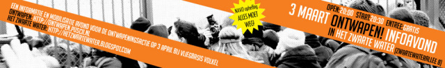 Ontwapen info-tour doet Zwolle aan op 3 maart  ONTWAPEN! info-avond in Zwolle - 3 maart - Het Zwarte Water Op zaterdag 3 april 2010 organiseren Ontwapen! en Akties tegen Kernwapens een manifestatie en actie bij kernwapenbasis Volkel in Noord-Brabant, in het kader van een internationale actiedag voor ontwapening. De jaarlijkse Paasmars voor Vrede en Ontwapening sluit zich hier bij aan. Na een bijeenkomst met sprekers en muziek aan de hoofdpoort, volgt een grootschalige ‘opruimingsactie’ op de basis. Op woensdag 3 maart komt een delegatie van de actiegroep ONTWAPEN! een informatieavond houden in Zwolle over de te houden actie. Deze informatieavond is onderdeel van een grote info-tour die ONTWAPEN! doet door heel Nederland. ACHTERGRONDINFORMATIE Ondanks jarenlange protesten liggen op Volkel nog altijd 20 Amerikaanse atoombommen opgeslagen. Nederlandse F16-piloten worden opgeleid om deze af te kunnen werpen in NAVO-verband. Mogelijk kernwapengebruik vormt een van de hoekstenen van het Strategisch Concept van de NAVO, dat zich in de eerste plaats richt op het beschermen van de belangen van de eigen lidstaten. Belangen die desnoods met geweld, tot de inzet van atoombommen aan toe, afgedwongen kunnen worden. Daarmee leveren deze kernwapens ook een bijdrage aan het in stand houden van armoede en ongelijkheid in de wereld. Een actie tegen de kernwapens op Volkel is dan ook tegelijkertijd een actie voor een eerlijkere welvaartsverdeling en meer mondiale solidariteit. Volgens een uitspraak van het Internationaal Gerechtshof in 1996 is het inzetten van kernwapens een misdaad tegen de menselijkheid. Dreigen met inzet, waaronder ook het voorhanden ervan hebben valt, is eveneens gekwalificeerd als misdadig volgens het internationaal recht. Een ieder heeft het recht, zelfs de plicht, misdaden tegen de menselijkheid te voorkomen. Met de actie op 3 april bij Volkel zullen de deelnemers invulling aan deze plicht geven. Laat de wereld zien dat er nog steeds mensen tegen het produceren, opslaan en gebruiken van massavernietigingswapens zijn (door welk land dan ook). Sluit je aan bij de manifestatie en/of de actie op zaterdag 3 april! OVER ONTWAPEN! Ontwapen!, een samenwerkingsverband van anti-militaristische organisaties en individuen, is onstaan in 2005 vanuit het verzet tegen de wapenbeurzen ITEC en UDT te Amsterdam. Er zijn inmiddels Ontwapen!-acties geweest tegen de andere wapenbeurzen, organisaties die in wapens handelen en het militaire apparaat zelf. Info over ONTWAPEN!: http://ontwapen.puscii.nl DE INFO TOUR Ontwapen! organiseert een infotour over de actie in Volkel. Tijdens deze infotour zal Ontwapen! ingaan op de functie van de NAVO en op het gebruik en de aanwezigheid van kernwapens. Daarnaast zal een belangrijk gedeelte gaan over de aankomende actie, wat er in Volkel georganiseerd wordt en wat je zelf kunt doen. Op woensdag 3 maart zal de infotour Zwolle aandoen in Sociaal en Creatief Centrum Het Zwarte Water. Adres: Zwartewaterallee 8. Open 20:00uur, aanvang 20.30uur. Entree is gratis. Website: http://hetzwartewater.blogspot.com |