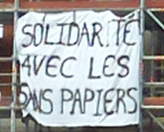 This afternoon a banner reading "Solidarite avec les sans papiers" was hung from the scaffolding on the town hall in Calais. While the local council tries to clean up its municipal image they cannot hide the dire situation being faced by hundreds of migrants on the streets of the town. Not carrying their identity documents in solidarity with the migrants they been working with these last few days, the three people arrested are currently being held inside the police station for an ID check and questioning.