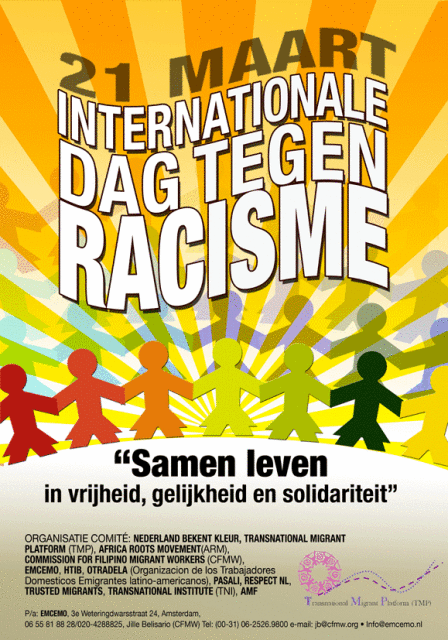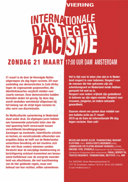 21 maart is de door de Verenigde Naties uitgeroepen als dag tegen racisme.   Dit naar aanleiding van demonstraties in Zuid-Afrika tegen de zogenaamde pasjeswetten, die identiteitskaarten verplicht stelden voor zwarte mensen. Deze demonstraties hadden tientallen doden tot gevolg. Op deze dag wordt sindsdien wereldwijd stilgestaan bij het belang van de strijd tegen racisme en elke vorm van discriminatie. De Multiculturele samenleving in Nederland staat onder druk. De afgelopen jaren hebben een toenemende polarisatie laten zien die veel spanning heeft veroorzaakt tussen verschillende bevolkingsgroepen. Aanslagen op moskeeën, islamitische scholen en kerken, en verontrustende uitkomsten van enquêtes (bijna de helft van de Nederlandse autochtone bevolking wil dat moslims zich hier niet thuis voelen) stemmen somber. Versterkt door de eenzijdige beeldvorming en berichtgeving ontstaat momenteel een benauwend leefklimaat voor de overgrote meerderheid van allochtonen, die met inachtneming van de hier geldende regels, maar met behoud van hun rechten, willen samenleven. Het is tijd vom te laten zien dat er in Nederland respect is voor iedereen. Respect voor de mensen die hier gekomen zijn als arbeidsmigrant en Nederland mede hebben gemaakt tot wat nu is. Respect voor ieders vrijheid zijn godsdienst te beleven op zijn eigen manier. Respect voor vrouwen, jongeren, en iedere seksuele geaardheid. Daarom vieren we samen door middel van een ludieke actie op 21 maart 2010 om 17 uur op de Dam de internationale VN-dag tegen racisme. Kom ook. Nederland Bekent Kleur en Transnational Migrant Platform (TMP) |