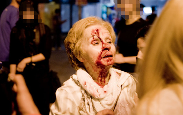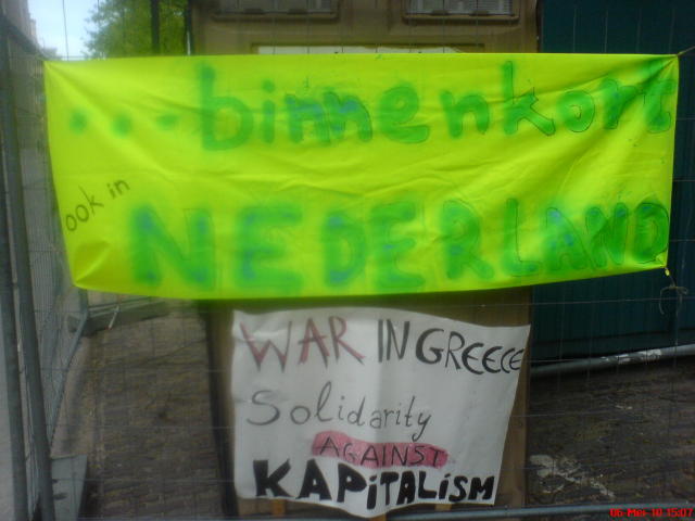 In Athene worden zelfs oudere mensen kapotgeslaan door de politiekrachten. Deze foto is van 5 mei savonds. Deze vrouw was ook aan het demonstreren. kraakpanden op extreem geweldadige manier aan het ontruimen - meer dan 200 arrestaties in 2 dagen - veel gewonden door politie acties tijdens de demonstraties en de situatie erna  Demonstrant van 5 mei in Athene   Daarnaast, worden in alle kraakpanden op extreem geweldadige manier arrestaties en vernieling van pand en spullen. Alle kraakpanden worden ontruimd. Krakers sturen lastminute sms-en met berichten zoals: "we zijn helemaal alleen", "nienand komt ons helpen". De geweldadige manier waarop deze acties plaats vinden roepen voor alleen maar een ding, solidariteit. Mensen in opstaan tegen de capitalisme. Vanuit krakers tot met bejaarden met verlaagde pensioen, worden mensen in Athene nogsteeds zonder discriminatie zwaar geslaan door ME en andere forces (motorbike D, speciale units, veel traangas en raketten geluid/licht) Politiekrachten volgen mensen tot aan hun huizen, breken in en slaan ze kapot - mensen die na de demonstratiwe naar huis wilden, in rook en smoke. Een vlammende Athene, brandende lucht en voor iedereen een teroriserende sfeer door de massale achtervolgingen en arrestatie golven. De ME komen allerlei cafe's, ontmoetingsplekken van migranten en anarchisten in Exarcheia en vernielen alles, steken branden, met als excuus een eventuele arrestatie als er iemand verdachts binnengevonden is. Natuurlijk zonder taal. Ze praten niet. Omringende mensen/burgers roepen "Schande" voor de talloze brutale insidenten per minuut. In alle bevolkingslagen en stromingen is er disbalance. Drie politieke leden van PASOK (regerende partij) en 1 van ND (tegeenpartij) zijn uit hun eigen partijen geschorst omdat ze "tegen" hebben gestemd over het wel of niet verder met de besluit gaan over de economische maatregelingen, i.a.v. alle onrust. Zodra die 4 mensen "ja" stemden, werden ze gelijk verwijderd van nhun partij lijsten. Democratie??? |