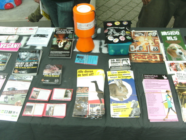 Vrijdag 14 mei 2010, Emmen Vandaag hebben we met respect voor dieren een stand gedraaid tegen circus Humberto op de markt van Emmen. Dit dieren circus heeft behalve leeuwen ook lama's dromedarissen, paarden, ossen, koeien en andere exotische dieren. Deze dieren zitten dag en nacht opgesloten in overdekte buitenverblijven tot dat zij weer de piste in moeten of voor vervoer de transport wagen weer ingeleid worden.  Tijdens de stand hebben de activisten van Respect voor Dieren veel informatie kunnen verstrekken en goede gesprekken kunnen voeren met het winkelend publiek. De acties van Respect voor Dieren in Emmen zullen aan blijven houden tot dat circus Humberto de tent weer ingepakt heeft. Morgen zal Respect voor Dieren ook aanwezig zijn met een stand bij de Hardcore punk show van subversivos en devotos uit Brazilië in Huize Spoorloos. Tot de laatste kooi leeg is!!! |