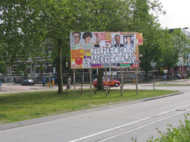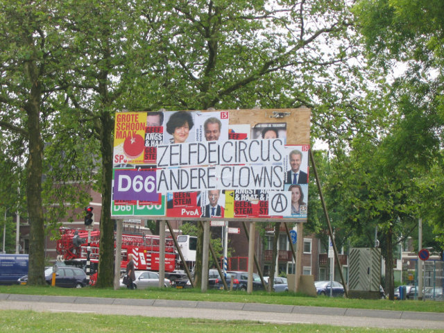 aan de campagnes van de Belgische (Communistische) Pvda denken, met die verwijzingen naar clowns. Ik weet niet of dat de bedoeling is maar dat vind ik dus toch niet zo overtuigend. | |
