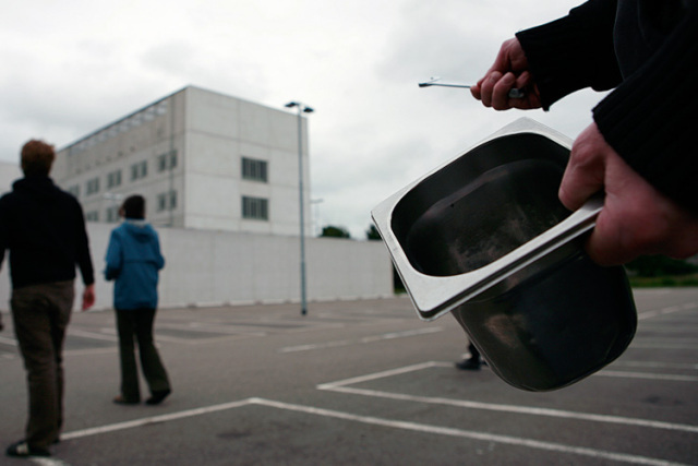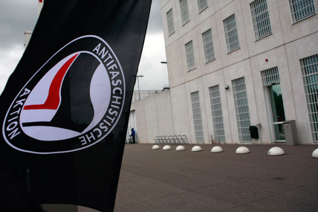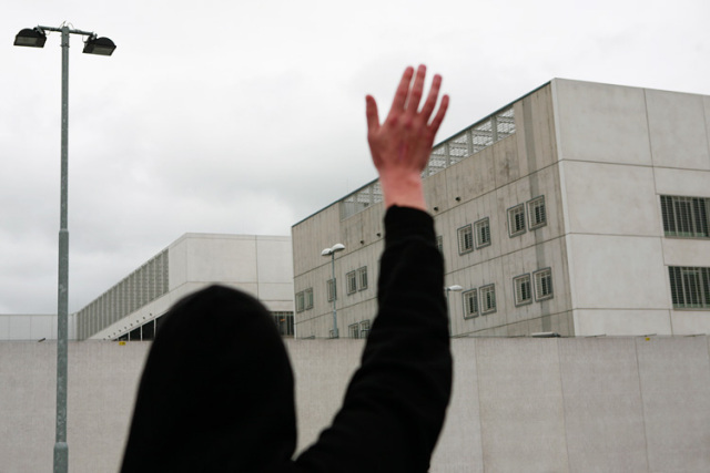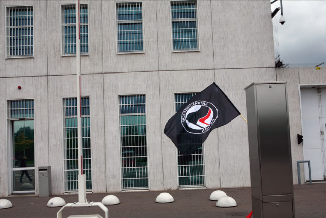 De kleur van grijze wolken verleende het 'Detentiecentrum Alphen aan den Rijn' een passende schutkleur. Het uiterlijk van dat gebouw biedt een tekenende weergave van haar functie: doods, saai en zwaar, ergens op een industrieterrein. Tegenover dat stuk gestolde ellende hebben zo'n vijftig mensen gisteren met lawaai en een paar korte, opzwepende toespraken hun steun laten blijken aan de mensen binnen. Voor zover we konden zien waren die er blij mee, een van de mooie momenten is het wanneer we contact met elkaar hadden door te zwaaien. Dat ging iets minder goed dan bij een vorige gelegenheid. Aan de zijkant van gebouw links van de ingang was het toen goed mogelijk elkaar over de slotgracht heen te zien, maar nu zaten er twee zaken in de weg. Het seizoen maakte dat er bladeren aan de bomen zaten, en de dienstdoende agenten meenden dat we niet aan die kant mochten staan omdat we daarvoor 'geen toestemming hadden gevraagd'. Natuurlijk hebben we ontkend die nodig te hebben, maar toen het er langzaamaan naar duw en trekwerk ging uitzien is toch besloten terug te gaan naar de voorkant. Misschien iets om bij de planning een volgende keer nog even bij stil te staan. Van binnenuit is nog gebeld naar een van de deelnemers om te laten weten dat mensen blij waren met onze aanwezigheid. Een druppel op een gloeiende plaat natuurlijk, maar toch een opsteker. Laat het een - zoveelste - eerste stap zijn. Rondom bajessen en cellencomplexen staan vaak duizenden kleine krassen en deukjes in het straatmeubilair gegrift door het nog wat machteloze gebaar van pollepels, stenen en pannen waarmee mensen lawaai hebben gemaakt. Die krasjes zijn als 1 cents-monumentjes van het verzet tegen opsluiting en onderdrukking van de mensen binnen, tegenover de miljoenen-monumenten voor die onderdrukking die de bajessen zijn. Laten we eraan werken die balans om te keren. Tot alle kooien leeg zijn en stukgeslagen. AFADenHaag bedankt. Alphen, helaas tot ziens! | |