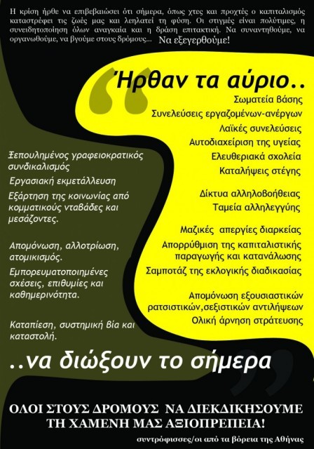 “Tomorrow has come, to banish today” (a poster distributed in Athens these days) The poster below is distributed on the streets of the Northern suburbs of Athens. Making a play of words with a popular saying (the original saying is “the wild animals have come to banish the tamed”) the poster reads: Tomorrow has come to banish today The crisis has come to confirm that today, same as yesterday, capitalism destroys our lives and lootes nature. The moments are crucial, the consciousness-raising among all of us is vital, action is imperative. Let’s meet up, let’s organise, take to the streets… Let’s revolt! Tomorrow has come: base trade unions, assemblies of workers and unemployed, popular assemblies, self-organisation of health, libertarian schools, housing occupations, mutual aid networks, solidarity funds, mass indefinite strikes, dislocation of capitalist production and consumption, sabotage of the electoral process, isolation of racist and sexist views, full consciensious objection. To banish today: Sold-out bureaucratic syndicalism, labour exploitation, dependence of society from party pimps and middle-men, isolation, allienation, individualism, commercialised relationships, desires and everyday conditions. Systemic violence and repression. Everyone to the streets, to claim back our lost dignity! Comrades from the North of Athens link: http://www.occupiedlondon.org/blog/2010/07/12/332-tomorrow-has-come-to-banish-today-a-poster-distributed-in-athens-these-days/