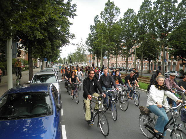 Een groep van ongeveer 100 kritische fietsers heeft zondagmiddag 1 augustus een tocht door het centrum van Den Haag gemaakt. Zij wilden hiermee duidelijk maken dat auto's een veel te dominante en aggressieve rol innemen in de publieke ruimte. Door met de hele groep op de rijbaan voor auto's te gaan fietsen wilden ze ook duidelijk maken dat fietsen veiliger, gezonder en beter voor het milieu is. De stoet werd begeleid met muziek, opgewekt door zonne-energie vanaf een bakfiets. De fietsen, waaronder racefietsen, ligfietsen, bakfietsen en zelfgebouwde creaties als 'tallbikes', waren versierd met vlaggen en verklede mensen. Op de hoek van de Elandstraat en de Zoutmanstraat werd een minuut lang het gehele kruispunt geblokkeerd. Op die hoek werd op 2 mei 2008 Freek, een vriend van vele van de deelnemers, door een vrachtauto het leven ontnomen. Onder de noemer 'Critical Mass' worden over de gehele wereld vaker dergelijke fietstochten gehouden, Deze evenementen worden vaak gehouden om duidelijk te maken dat fietsers een prominentere rol zouden moeten hebben in het verkeer, in plaats van dat ze altijd voor auto's moeten wijken. De stoet is veilig en zonder problemen verlopen. Alle omstanders, zowel automobilisten als fietsers en voetgangers, reageerden positief op de optocht en de flyer die uitgedeeld werd. Velen sloten zich bij de groep aan. | |
