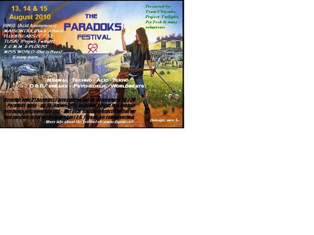 Linksboven op de flyer: 13, 14 & 15 August 2010 RINSE (Acid Anonymous) MAISON DUL(Rock 'n Rave) FLUOFREAKS (T.T.S) TUSKI (Project Twilight) Z.E.M.M. & PLOERT MISS WORLD (Bar is Boos) & many more Middenboven op de flyer: THE PARADOKS FESTIVAL (A) Rechtsboven op de flyer: Presented by: Team Ubercake, Project-Twilight, PsyTech & many volunteers Middengedeelte op de flyer: Minimal - Techno - Acid - Tekno D&B/Breaks - Psychedelic / Worldbeats Linksonder op de flyer: Benefiet voor 21 bezetters/arrestanten van de Herengracht 36/38 - Paradoks aktie - op 24 januari 2010, in Leiden. 20 van hen hebben een boete gekregen van 200,- Met deze solidariteitsactie willen we hen steunen in het verzet tegen het E.U./Kraak- en cultuurverbod.. More info about the festival at: www.djguide.nl Rechtsonder op de flyer: Damage: euro 5,- Verder is Paradoks een pand dat begin dit jaar gekraakt is en ligt in Leiden. De bezetters zijn allemaal gearresteerd binnen een zeer korte tijd en dit heeft ze een boete opgeleverd van €200,- p.p. Een benefiet is dus op zich wel op zijn plaats. | | wel collectief, geen zelfmedelijden ajb | hedendaagje - 04.08.2010 10:17