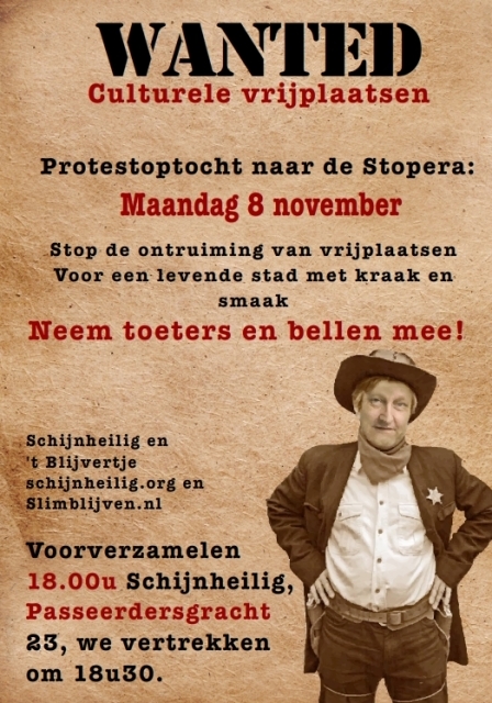 Stop de ontruiming van vrijplaatsen Voor een stad met kraak en smaak! Aanstaande dinsdag wordt een tiental woningen en vrijplaatsen ontruimd, waaronder ’t Blijvertje en Schijnheilig. Er is geen enkele noodzaak, geen urgentie om deze panden te ontruimen. Twee levendige sociale centra worden hierdoor kapot gemaakt. Wij roepen iedereen op die hart heeft voor de stad om maandag te komen demonstreren. Om te eisen dat deze panden behouden blijven. Kom ook! Laat je horen!  Schijnheilig heeft aan de Passeerdersgracht een bloeiend cultureel centrum weten neer te zetten. Iets wat de gemeente met miljoenen aan subsidies niet voor elkaar kan krijgen. ‘t Blijvertje heeft zich in drie en een half jaar tot een essentiële plek voor de buurt ontwikkeld en onpopulaire sloopplannen weten te voorkomen. De gemeente wil burgerparticipatie, maar zodra Amsterdammers zelf initiatief ondernemen, probeert ze het om zeep te helpen. Beide plekken worden nu ontruimd. En waarvoor? …. Ja waarvoor eigenlijk? Er is geen overlast, er zijn geen plannen. Voor niets anders dan de politieke profileringsdrang van burgemeester van der Laan, die deze ruimtes slachtoffert om zo zijn reputatie als law & order hardliner te vestigen. In Rotterdam, Utrecht, Den Haag, Nijmegen en Groningen is het stadsbestuur terughoudend met ontruimen. Alleen in Amsterdam heeft de burgemeester besloten om de voet vol op het gaspedaal te zetten. Van der Laan laat zich kennen als de voorhoede van het nieuwe rechtse repressieve beleid. Schijnheilig en ‘t Blijvertje roepen iedereen op: studenten, krakers, kunstenaars, muzikanten, buurtbewoners, sympathisanten, creatievelingen, hangjongeren en -ouderen, working class heroes, kortweg iedereen die wil opkomen voor een vrije, levende stad, zonder betutteling en repressie. Het wordt een verontwaardigde maar vreedzame creatieve optocht, neem bellen en toeters en muziekinstrumenten mee. 18u verzamelen bij Schijnheilig (Passeerdersgracht 23bg), 18u30 vertrekt de stoet |