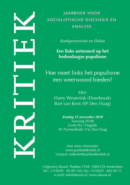 voor wie er zondag niet bij kan zijn, of den haag te ver vindt, is er zaterdag 20 november om 14:00 een workshop verzorgd door jaarboek kritiek op het 2.Dh5 festival te Tilburg (locatie: Cinecitta: Willem II straat 29). zie: http://2dh5.nl/index.html?art_id=446&vlag1=2&vlag2=10 voor slaapplaats, mail: slaapplek@2dh5.nl op het festival kunnen we ook nog vrijwilligers gebruiken voor allerlei hand en span diensten, maar vooral voor het maken van verslagen van de workshops en voor het verzorgen van een fluistervertaling, indien nodig. je kan je hiervoor melden bij info@2dh5.nl. Jaarboek Kritiek: links en de ruk naar rechts (Cinecitta) In de laatste jaren heeft de politiek in Nederland een scherpe ruk naar rechts gemaakt. Het is zelfs zover gekomen dat Wilders (in feite) deel uitmaakt van de nieuwe regering. Deze ontwikkeling stelt ons voor twee prangende vragen: 1.) waarin licht de kracht van het rechts-populisme en 2.) hoe kan/moet Links deze ontwikkeling omdraaien. In het kort gaat het om de vraag hoe Links opnieuw het initiatief naar zich toe kan trekken. Dit alles is des te belangrijker geworden omdat ‘klassiek-linkse’ actiemethoden niet meer lijken te werken. Manifestaties zoals die van Nederland bekent kleur, of acties van Wilders sluit ook jou uit krijgen weinig response, weinig aandacht en lijken weinig effectief. Er moet dus weer eens hard nagedacht worden over effectieve acties en manieren om in het politieke debat in te grijpen. Onlangs is er een nieuw nummer uitgekomen van Kritiek. Jaarboek voor socialistische Discussie en Analyse dat precies om deze thema’s draait. Geëngageerde wetenschappers uit Nederland, België en Amerika analyseren de opkomst van het rechts-populisme in deze verschillende landen en dragen tevens ideeën aan hoe deze ontwikkeling te keren. De discussiebijeenkomst wordt geen verkooppraatje. We willen de uitkomsten van verschillende onderzoeken en discussies presenteren en een diepgaande discussie inleiden over de vraag hoe Links effectief in het politieke debat kan ingrijpen. Sprekers zullen zijn Bart van der Steen en Merijn Oudenampsen en er zal ruimte zijn voor inbreng vanuit de zaal. Verwacht dus geen hapklare oplossingen voor het rechts-populisme van deze tijd. Verwacht wel een hard verhaal over het falen van links en een stevige discussie waar we steken laten vallen. Rechts wint, wat is onze tactiek? E-Mail: info@2dh5.nl Website: http://2dh5.nl | |