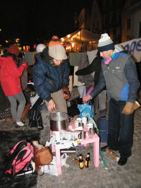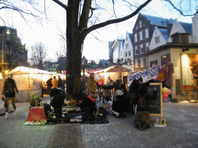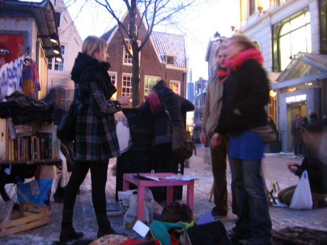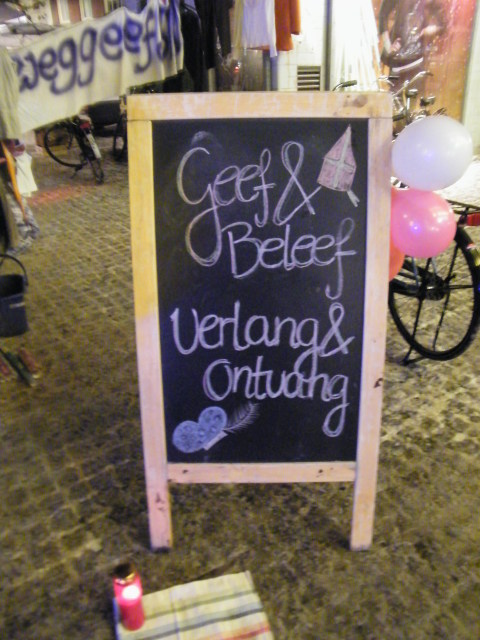Gistermiddag hebben een aantal Sinten en Pieten verkleed als “gewone” mensen, een weggeefwinkel geopend op het Spui.        Het idee was om mensen eraan te herinneren dat wat wij Sinterklaas vieren noemen, voornamelijk gecreeerd is door de commercie. Sinterklaas is waarschijnlijk gebaseerd op Nicolaas van Myra, afkomstig uit wat nu Turkije is, en dat had helemaal niks met geld uitgeven te maken, maar ging juist om iets geven aan de armen. Tegenwoordig voelen mensen zich verplicht om er geld aan uit te geven, ook al hebben ze het misschien eigenlijk niet. In de weggeefwinkel werden kleren, boeken, diverse prullaria, warme chai en pepernoten aangeboden aan voorbijgangers. Deze waren soms hartelijk verrast of verbaast, erg nieuwsgierig en dikwijls wisten ze het ook niet erg goed te plaatsen. “Willen jullie echt geen geld dan?” De Sinten en Pieten waren erg blij met deze actie. Het was erg fijn om de mensen op straat aan te spreken en iets aan te bieden, en te merken dat er achter soms sombere, gesloten gezichten toch dikwijls een hartelijk persoon schuilt. Hopelijk ziet ook de Kerstman dit jaar in dat hij al geld genoeg heeft en dit jaar de kadotjes gewoon weg kan geven. |