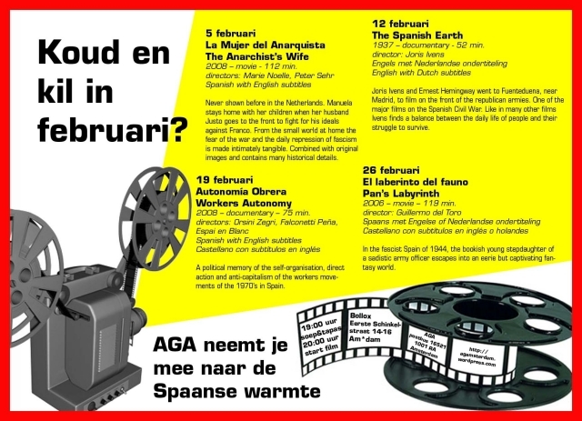 Koud en kil in februari? AGA neemt je mee naar de Spaanse warmte! Start films 20:00 uur Vanaf 19:00 uur is er soep en of tapas Anarchistische Bibliotheek, Eerste Schinkelstraat 14-16, Amsterdam  5 februari La Mujer del Anarquista The Anarchist’s Wife 2008 – movie – 112 min. directors: Marie Noelle, Peter Sehr Spanish with English subtitles Castellano con subtítulos en inglés Never shown before in the Netherlands. Manuela stays home with her children when her husband Justo goes to the front to fight for his ideals against Franco. From the small world at home the fear of the war and the daily repression of fascism is made intimately tangible. Combined with original images and contains many historical details. 12 februari The Spanish Earth 1937 – documentary – 52 min. director: Joris Ivens Engels met Nederlandse ondertiteling English with Dutch subtitles Joris Ivens and Ernest Hemingway went to Fuenteduena, near Madrid, to film on the front of the republican armies. One of the major films on the Spanish Civil War. Like in many other films Ivens finds a balance between the daily life of people and their struggle to survive. 19 februari Autonomía Obrera-Workers Autonomy 2008 – documentary – 75 min. director: Orsini Zegri, Falconetti Peña, Espai en Blanc Spanish with English subtitles Castellano con subtítulos en inglés A political memory of the self-organisation, direct action and anti-capitalism of the workers movements of the 1970’s in Spain. 26 februari El laberinto del fauno Pan’s Labyrinth 2006 – movie – 119 min. director:Guillermo del Toro Spaans met Engelse of Nederlandse ondertiteling Castellano con subtítulos en inglés o holandes In the fascist Spain of 1944, the bookish young stepdaughter of a sadistic army officer escapes into an eerie but captivating fantasy world. E-Mail: agamsterdam@yahoo.com Website: http://www.agamsterdam.wordpress.com |