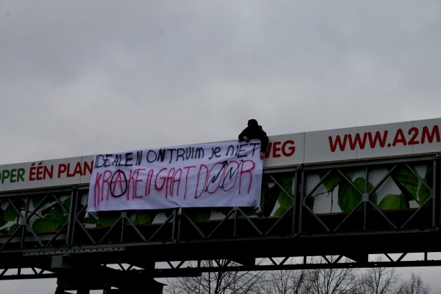 Op zondag-ochtend 6 februari hebben we een groot spandoek aan een brug gehangen. Hiermee willen we een duidelijk signaal afgeven tegen de ontruiming van de dag ervoor en laten zien dat we zullen door kraken!   De uren verstreken en honderden passanten zullen de boodschap gezien hebben. Omdat zonsondergang steeds dichterbij kwam, en het bij het toevallig passeren er nog steeds hing, besloten we het spandoek weer mee te nemen, zodat we het een andere dag opnieuw konden gebruiken ;) Kraken gaat door, wet of geen wet! |