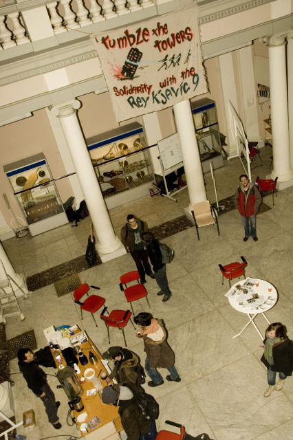 From the temporary autonomous zone of the occupied university of Utrecht in the Netherlands we bring a greeting of solidarity to our comrades of the Reykjavik 9 and everyone who continuous to struggle on their sides.   Our struggle knows no borders; from the Arab world and throughout the European societies people are fighting with an undying passion for social change. They are tired of being ruled by an elite class of bankers, politicians and managers who make decisions for them and hand them out to the crisis based neo-liberal system. The clowns change their costumes, paint their faces in different colours, but the circus stays the same. The rhetoric of the clowns that “austerity cuts are necessary because we are all responsible ” is a complete and absolute lie. Just another justification to steal the money and rights of the people and fortify the reproductive cycle of the status quo. The reality shows that the money is not taken back from the bankers and the wealthy that for so many years flourished in the creation of unstable economic and political systems. They are not hold responsible for the risks they took, but instead rewarded by massive bailouts. Through media spectacles a select few are chosen to be let to the guillotine of public prosecution for the masses to manifest their anger. While behind the curtains, once again the marginalised of society, the workers, students and migrants are robbed of their social security and dignity. We realise that our struggle does not stand alone, but is connected, because their system is also connected. We call out for international solidarity and uncompromising and absolute NO to their system. From one barricade to another, Tumble the towers! The new grounds collective |