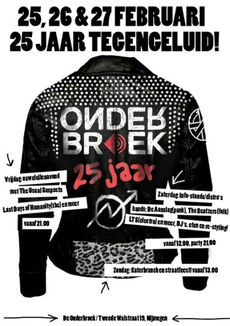 Onafhankelijk podium De Onderbroek viert 25e verjaardag met feestweekend!  In een tijd waarin veel culturele podia ten onder dreigen te gaan aan schaalvergroting of het wegvallen van subsidies viert De Onderbroek in Nijmegen alweer haar 25e verjaardag. Het podium ontstond begin 1986 toen een klein groepje in de kelder van kraakpand De Grote Broek een eigen kroeg begon. Na een paar weken vonden er al de eerste concerten plaats, en ook nu biedt De Onderbroek nog steeds een kleinschalige, laagdrempgelige plek aan nieuwe, niet-commerciële muziek waarvoor elders in de stad vaak geen ruimte is. Je kunt er inmiddels meerdere malen in de week terecht voor concerten, films, jamsessies en kroegavonden. Er wordt nog steeds veel hardcore en punk geprogrammeerd, maar je kunt er ook bijvoorbeeld akoestische folk, electronische dansmuziek of experimentele geluiden horen: van internationale underground artiesten tot bands die regelrecht uit de aangrenzende oefenruimtes komen. Veel inmiddels bekendere nationale en regionale acts als Antillectual, De Staat en De Kift deden dan ook podiumervaring op in de ‘OB’. Ook nu draait De Onderbroek nog voor 100 % op vrijwilligers en is het activistische karakter niet verloren gegaan. De opbrengst wordt verdeeld over verschillende goede doelen en er worden regelmatig benefietavonden georganiseerd voor politieke en maatschappelijke organisaties. Daarnaast worden de kosten voor entree en (ecologische) drank laag gehouden, zodat het podium ook toegankelijk is voor minder kapitaalkrachtigen. Natuurlijk hopen we tijdens onze verjaardag weer veel oude bekenden en nieuwe gezichten te verwelkomen. Entree is het hele weekend gratis, al is een vrijwillige bijdrage aan de onkosten altijd welkom. Neem dus even een kijkje in het programma en kom langs in de Onderbroek (en uiteraard kun je van vrijdag tot en met zondag ook weer terecht in de Klinker voor een heerlijke veganistische maaltijd)! PROGRAMMA Vrijdag 25 februari De Onderbroek / 21.00 / Ouwelullenavond met 3 live bands en DJ Nostalgisch wederzien voor oudgedienden en vastgeroest meubilair (en iedereen die dat nog wil worden). Met anarchistische skapunk van The Usual Suspects, de onlangs weer opnieuw opgewarmde grindcorelijken van Last Days of Humanity, brute crustpunk van GBO en fijne plaatjes van DJ Markus. Zaterdagmiddag 26 februari De Onderbroek en De Klinker / 13.00 -19.00 / Dagcafé met film, restyling, boeken- en infomarkt Zaterdagmiddag kun je rondkijken bij de stands van verschillende distro’s en actiegroepen. Er worden films vertoond, en een kapper, piercer, zeefdrukker, tatooeerder en andere beautyspecialisten staan klaar voor een extreme OB makeover! En natuurlijk lekkere hapjes, drankjes en taart. Zaterdagavond 26 februari De Onderbroek / 20.00 / Live ska, punk, crust, electro, metal en String Swing afterparty! Last Legion Alive en Silence Means Death zijn twee crustbands met een rauwe metal sound uit de donkerste krochten van België, siked! Maximale dansgarantie is er bij de electronische postpunk van LTS en voor de verandering is er ook punk: Nederlandstalige meeschreeuwers van De Aanslag. En dan ook nog de Beatzers en die spelen circuspolka: “komt dat zien!” Tot slot draaien de String Swing dj’s danskrakers van heb ik me jouw daar. Gaaf? Heul!! Zondag 27 februari De Klinker / 13.00 / katerbrunch Coffee... need.... coffee... En meer lekkers voor alle brakke zombies. P.S. Bij gebrek aan de juiste connecties bij de gemeente komt het straatfeest op zondag te vervallen. Website: http://www.grotebroek.nl |