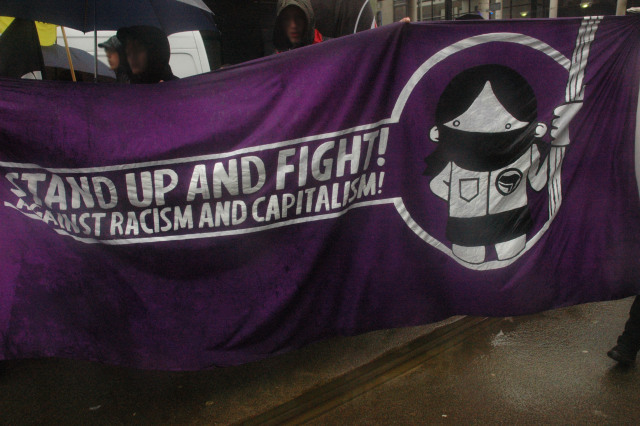 In de stromende regen verzamelde zich zo’n 60 mensen om te demonstreren tegen racisme en voor solidariteit. Nadat een spreker van AFA Den Haag nog eens benadrukte dat het niks uit zou moeten maken waar je geboren bent, welk geloof je toevallig hebt kwam de demonstratie in beweging.     Met leuzen als “Geert Wilders en de PVV, opgerot en weg er mee” en “Geen man geen vrouw geen mens is illegaal” werd er een route gelopen door de Schilderswijk en Transvaal. Er werden honderden flyers uitgedeeld en ook trad gettobeats formatie Dagga D’agga op met MC Desh. Ondanks de regen kwamen er veel positieve reacties op de demonstratie. Op het eindpunt waren er nog twee sprekers. De eerste, van Werkgroep Stop Deportaties (WSD) sprak over het racisme van geld en wet. Dit racisme wordt opgeroepen omdat de politiek een zondebok nodig heeft om de aandacht af te leiden van de kapitalistische uitbuiting die leidt tot hoge huren en lage lonen. Dit zijn gevolgen die voelbaar zijn voor wat wordt genoemd “de eigen bevolking”. Laat deze ‘eigen bevolking’ vooral niet in opstand komen, is de gedachte. Laat deze liever trappen naar onderen. Laat hen wijzen naar mensen die nog vele malen harder door het kapitalisme worden getroffen: de vluchtelingen, de migranten, de ‘buitenlanders’. Mensen die in het land waarvandaan zij komen op wereldschaal worden uitgebuit, hun grond en water gebruikt voor ons afval, hun arbeid voor onze producten. Het racisme is gepland, in wetten en regels gevat, wordt gecoördineerd en geleid. Daarna was er een spreker van Doorbraak een linkse basisorganisatie, die sprak over de bezuinigingen die het rechts kabinet wil door duwen. Aan de ene kant pakt de regering studenten, uitkeringsgerechtigden, zieken, aow’ers en aan de andere kant bevoordeeld deze regering grote drijven, rijke en super rijke mensen. En dat is onrechtvaardig! Laat de rijken de zwaarste lasten dragen! De regering voert een verdeel en heers politiek, groepen mensen worden tegen elkaar uitgespeeld bijvoorbeeld zogenaamde “autochtonen” en zogenaamde “allochtonen”. Daarbij geven Rutte en zijn vriendje Wilders constant moslims de schuld van waar de rijken en machthebbers de schuldige van zijn. We moeten ons niet gek laten maken door al dat racisme en de zondebok politiek van deze regering. We moeten samen sterk staan! Tegen racisme! Ook al regende het heel de dag en was de opkomst niet zo hoog het was een strijdbare demonstratie. Op naar de volgende! Samen sterk tegen racisme en uitsluiting! E-Mail: info (at) afadenhaag.nl Website: http://denhaagtegenracisme.wordpress.com |