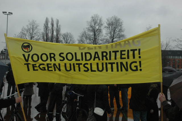 Kom in verzet, tegen het racisme van geld en wet! Het racisme in deze samenleving is institutioneel. Het wordt opgeroepen, aangewakkerd en in stand gehouden door de politiek. Wilders is hiervan slechts een exponent. Wilders is het resultaat van een al decennia durende hetze van zogenaamd democratische lieden uit partijen als CDA en PvdA. Een hetze die de extreem rechtse onderbuikgevoelens aanjaagt en legitimeert alsof ze vanzelfsprekend zijn. De populistische ideeën van Wilders worden overgenomen door andere politici en zo wordt de hele samenleving steeds racistischer. De ideeën van Janmaat in de jaren tachtig, die we toen nog onomwonden een fascist mochten noemen, zijn heden gemeengoed en werden al door Verdonk verkondigd een paar jaar geleden. Wie nu Wilders een fascist noemt, kan rekenen op een aanklacht. Wilders, de fascist zelf, mag zich beroepen op zijn vrijheid van meningsuiting, ook al zet deze aan tot haat en geweld. Door de jaren heen hebben politici stelselmatig migranten afgeschilderd als profiteurs en criminelen. Ze hebben hen niet alleen veroordeeld, maar ook illegaal verklaard, ongewenst verklaard, en opgejaagd. Dit is niet iets van de laatste jaren, dit gaat terug tot de invoering van de koppelingswet, terug tot de jaren tachtig, terug tot de jaren zeventig zelfs. Dit racisme wordt opgeroepen omdat de politiek een zondebok nodig heeft om de aandacht af te leiden van de kapitalistische uitbuiting die leidt tot hoge huren, lage lonen. Dit zijn gevolgen die voelbaar zijn voor wat wordt genoemd “De eigen bevolking”. Laat deze 'eigen bevolking' vooral niet in opstand komen, is de gedachte. Laat deze liever trappen naar onderen. Laat hen wijzen naar mensen die nog vele malen harder door het kapitalisme worden getroffen: de vluchtelingen, de migranten, de 'buitenlanders'. Mensen die in het land waarvandaan zij komen op wereldschaal worden uitgebuit, hun grond en water gebruikt voor ons afval, hun arbeid voor onze producten. Het racisme is gepland, in wetten en regels gevat, wordt gecoördineerd en geleid. Wanneer politici die verantwoordelijk zijn voor het zogenaamde 'vreemdelingenbeleid' worden aangesproken op individuele 'gevallen', mensen die slachtoffer zijn van hun beleid, zeggen zij dat ze het daar niet over willen hebben. Ze voelen zich niet verantwoordelijk voor mensen die verdrinken in de oceaan door het toedoen van het Europees grensagentschap Frontex dat op hun gammele bootjes invaart. Dit terwijl Nederland een fregat voor dit doel heeft geleverd. Zij voelen zich niet verantwoordelijk voor mensen die sterven op straat door kou, ziekte en ondervoeding, ook al maakten zij zelf hen het leven onmogelijk door hen recht op werk, onderdak en medische hulp te ontzeggen. Zij voelen zich niet verantwoordelijk voor mensen die sterven in detentiecentra, ook al lieten zij zelf die centra bouwen en huurden daarvoor personeel in. Zij voelen zich niet verantwoordelijk voor mensen die na hun deportatie in eigen land zijn dood gegaan, zoals Nezam Azimi, die in Afghanistan is ontvoerd, gemarteld en vermoord door de Taliban. Nee, ze willen het niet eens hóren. Verdonk, toen verantwoordelijk voor het lot van Nezam, niet. En Leers, nu verantwoordelijk voor Sahars deportatie naar datzelfde Afghanistan, ook niet. Verantwoordelijkheid komt alleen in de woordenboeken van deze moordenaars voor wanneer zij 'de vreemdeling' er op wijzen dat deze 'verantwoordelijk is' voor zijn of haar eigen 'vertrek' uit Nederland. De terminologie die politici al die jaren al gebruiken is er op gericht om mensen zwart te maken. Zo heten moeders van kinderen die worden opgesloten daarvoor verantwoordelijk, en niet de wet die het mogelijk maakt. Het is het omdraaien van de waarheid. Het herhalen van de leugen. En het werkt. Het is een beproefd recept. Waarom willen ze het niet horen? Het is simpel: omdat ze het dan moeten uitleggen. Hoe leg je uit dat je het niet erg vindt dat je iemand de dood hebt ingejaagd? Wetten en regels zijn beter uit te leggen dan de dood van een mens. Mensen worden nummers, getallen. Ze zijn de sluizen die worden geopend door Khadaffi, ze zijn de tsunami aan vluchtelingen, ze zijn de overlast op straat, ze zijn de naamlozen, gezichtslozen, ze zijn het gevaar voor de samenleving. Dit racisme is in wetten ingebed, al lang voor Wilders als schaduwpremier aan de macht kwam. Dit is het racisme van Kosto, van Cohen, van Verdonk, van Albayrak, en nu van Leers. De jacht op mensen met een andere huidskleur, op mensen zonder verblijfspapieren, is eens te meer geopend, of beter gezegd: uitgebreid, vernieuwd. Onder Kosto werden de eerste kampen voor opsluiting van mensen zonder papieren opgericht. Onder Cohen werd een nieuwe 'vreemdelingenwet' aangenomen. Het bestaan van zoiets als een aparte wet voor wat men noemt 'vreemdelingen' is in zichzelf al racisme! Onder Verdonk tekende de politie een prestatiecontract om mensen zonder papieren op te pakken. Vangstquota om aan te voldoen, een excuus voor de politie om onder het mom van 'we doen alleen maar ons werk' als moderne gestapo razzia's en invallen uit te voeren. Onder Albayrak werd alle noodopvang definitief vervangen door cellen, en mensen de straat op gestuurd. Het is de straat of de cel of deportatie zonder kans om te bestaan, of zelfs met gevaar voor eigen leven. Onder Leers worden vrouwen reizend in bussen van Connexxion aangegeven omdat hun huidskleur niet thuishoort in een villa wijk, en zij dus wel illegalen moeten zijn die bij rijke mensen thuis tegen onderbetaling aan het schoonmaken zijn. Oppakken en afvoeren maar! Het racisme is institutioneel. De door overheden bedachte term 'illegaal' wordt, als het aan Leers en consorten ligt, straks niet meer alleen een grond voor opsluiting en deportatie, maar ook strafbaar. En wie strafbaar is, is per definitie crimineel. Het is het sluitstuk van de racistische politiek. Het ene wetsvoorstel buitelt over het andere sinds Leers bij Wilders op schoot zit, het is teveel om hier op te noemen. Er 
