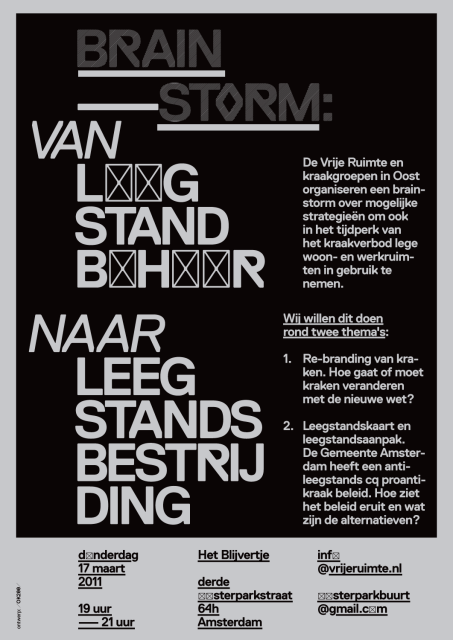 De Vrije Ruimte en kraakgroepen in Amsterdam Oost organiseren een brainstorm over mogelijke strategieën om ook in het tijdperk van het kraakverbod lege woon- en werkruimten in gebruik te nemen.
