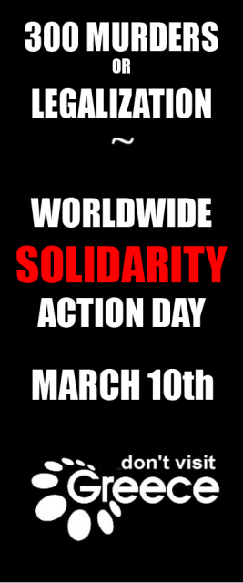 300 MURDERS OR LEGALIZATION Worldwide SOLIDARITY action day with the 300 immigrants-workers hunger strikers Thursday, March 10th  10th of March: Worldwide solidarity action day with the 300 hunger strikers immigrants-workers in Greece by ‘All Immigrants of the World’ We call people in Greece and throughout the world to carry out civil disobedience actions on the 10th of March in solidarity with the 300 hunger strikers. We ask everyone to target their actions against Greek soft spot-tourism: 15% of the nation’s Gross Domestic Product is coming from tourism. In fact, tourism and migration are two sides of the legal right of freedom of movement. We suggest an easily attainable target that people can find almost in every country: Greek National Tourism Organization. You can e.g. demonstrate, blockade, squat, spread leaflets or carry out other creative actions in front, inside or around GNTO offices. The addresses of the GNTO offices abroad are here: internezia.net/addresses If you don’t have a GNTO office at your city, you can target your actions against the Greek embassies or enterprises, or simply demonstrate in crowded public places or on media. 300 MURDERS OR LEGALIZATION |