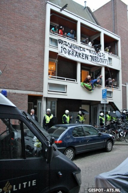 Van AT5: UPDATE: ME ontruimt woning Rapenburg De woning op Rapenburg in het Centrum is zondagavond ontruimd door de Mobiele Eenheid. Een groep van 20 tot 30 krakers had het pand eerder op de dag bezet. Toen de ME tot ontruiming overging, waren alle krakers het pand via het dak ontvlucht. De ME'ers werden tijdens hun actie flink uitgescholden door buurtbewoners. Er is niemand aangehouden. Zie op Gespot de video van de kraak en foto's van de ontruiming ---------------------------------------- Bedankt buurtbewoners, die de ME niet het portiek in wilden laten, en ze begonnen te jennen met spandoeken, toeters en bellen. En iedereen binnen is gelukkig via een listige manier weg kunnen komen, al was dat niet via het dak. Gna.