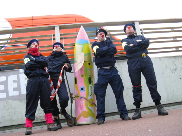 ..  afzender  adressering Bewijsstuk A is vanochtend aangeboden bij de rechtbank Den Bosch. Omdat het geval zo groot was paste deze niet door de bagage-controle bij de beveiliging. Daardoor is deze in een hoekje blijven staan, te wachten tot het werd opgeroepen. Maar de rechtszaak kwam niet verder dan het preliminair verweer van advocaat Meindert Stelling, die een ijzersterk betoog hield waarom kernwapens in strijd zijn met het internationaal recht. Wij wisten dat natuurlijk al, maar de rechters en OVJ niet. Zij kregen vandaag zomaar een uitgebreid college over internationaal recht en oorlogsrecht. Waarschijnlijk is het op dit moment nog steeds bezig. Het bewijsstuk was vandaag dus nog niet nodig en kon teruggestuurd worden naar vliegbasis Volkel. Opnieuw een risico transport van instabiel materiaal... dat wil zeggen... er was natuurlijk geen gevaar voor de gezondheid. De clownbeveiligers hadden heel zorgvuldig een stagiaire ingehuurd om met het bewijsstuk rond te sjouwen, zodat ze zelf voldoende afstand konden houden. Heel veilig dus! E-Mail: colonel@linuxmail.org | | nog een paar foto's | Elfie T - 04.04.2011 18:15