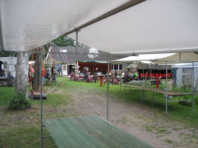 In het Friese Appelscha zijn de jaarlijkse Pinksterlanddagen van start gegaan. Bijna 200 bezoekers hebben zich inmiddels op het kampeerterrein Tot Vrijheidsbezinning verzameld. De hele dag is er gestaag gewerkt aan de opbouw van het anarchistische festival. Tientallen mensen droegen daaraan hun steentje bij.   Vernieuwde zijkant gebouw  Vernieuwde speelplaats De afgelopen weken hebben een aantal mensen tevens gewerkt aan het onderhoud van het anarchistisch terrein. Zo is het plafond in de grote zaal weer gerepareerd en in de oude glorie hersteld. Opvallender is het werk dat is verricht an de zijkant van het grote gebouw. Het houtwerk aan de bovenkant is geheel vernieuwd, waardoor de uitstraling van het gebouw heel anders is geworden. De aloude aankleding op het houtwerk met het gebroken geweer en de aanduiding '1969' is helaas gesneuveld maar er zijn concrete plannen om op korte termijn een nieuwe maquette te vervaardigen met daarop het bouwjaar van het pand en een gebroken geweer als symbool voor het antimilitarisme. Ook de speelplaats voor de knderen heeft een complete renovatie ondergaan. Het oude speelblok is verwijderd om plaats te maken voor een groter speel- en klimplek. De PL ging van start om 18.00 met een ingelast programmaonderdeel met oud-totaalweigeraar Stephan Kraan die terugblikte op zijn gevangenschap van precies 30 jaar geleden. In zijn oude gevangenis in Leeuwarden, de Blokhuispoort, wordt hierover momenteel een tentoonstelling gehouden. Daarbij werd de documentaire van omroep Fryslan vertoond waarin naast Kraan ook oud-totaalweigeraars Willem Bosma en Willem de Haan terugblikken op hun gevangenschap als principiële dienstweigeraars. Daarvoor afgaand werd een andere documentaire vertoond, De Nieuwe Hleden, uit 1982 waarin naast Stephan ook andere activisten aan het woord komen die zich inzetten voor een betere wereld. De officiele start van de Pinksterlanddagen is morgen op zaterdag 11 juni om 10.00 uur. Dit jaar staan er opnieuw bijna 30 bijeenkomsten op het programma. Voorts is er een cultuurprogramma, een kinderprogramma en een filmavond. Ook wordt er radio gemaakt. |