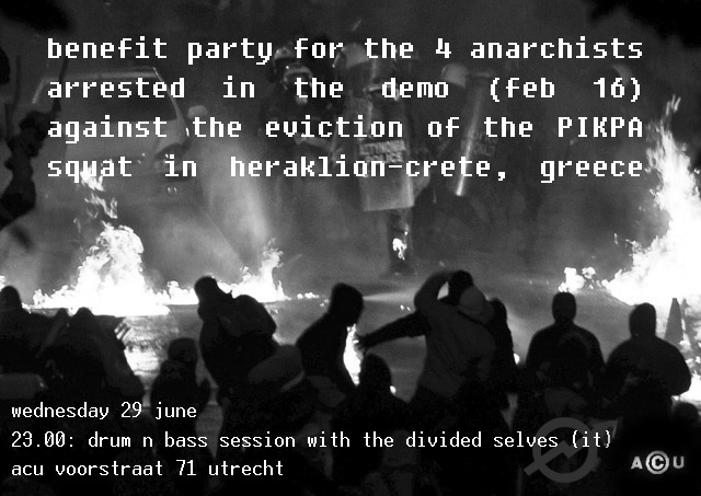 the letter from the heraklion anarchists' assembly can be accessed online here: http://indymedia.nl/nl/2011/03/74364.shtml I reproduce it below: -------------------------------------------------------------- Letter from The Heraklion (Crete) anarchists’ assembly about what followed PIKPA squat eviction on February 16th and calling for solidarity actions on March 8th. Heraklion, Crete: about PIKPA squat eviction, arrests and solidarity actions Letter from The Heraklion (Crete) anarchists’ assembly about what followed PIKPA squat eviction on February 16th and calling for solidarity actions on March 8th. Comrades and Friends we greet you, With this letter we’d like to inform you about the latest events here in Heraklion [ http://www.occupiedlondon.org/blog/2011/02/18/498-anarchist-squat-in-heraklion-crete-is-evicted/], to share with you some current issues that preoccupy us and present some suggestions in relation with solidarity moves. The fact that the regime targets at the people and spaces that lay the foundations for the existence of broader brewings which will lead to its subversion is not something new. Such efforts have taken place in the past a well, yet we assess that they will be more tense in the future, at the same time with the severe repression we all suffer. Being conscious of the fact that if we didn’t run up against the invasion in PIKPA (one of the two local squats), we would count with a negative consignment for our future (and not only for our city), we decided to proceed in a chain of actions. Among the other results of these actions we suffered the arrest of 4 comrades of ours (after a demonstration that made straight for the squat, several hours after its evacuation by the state). Two of these comrades were accused of felonious acts (and avoided the temporary incarceration under the obligation of paying a 40.000 euros’ guaranty altogether) and the other two of indictable offenses (with a corresponding guaranty of 6.000 euros altogether). For this reason we’ve created a solidarity fund for the arrested comrades. Relying on the values of solidarity and comradeship amongst those who struggle against the requisitions of the rulers, we appeal to you, so that: 1. you support the solidarity fund the way you judge (for example, by organizing various events and happenings for the financial support of the 4). This way we ‘ll be able to live up to the enormous judicial expenses and the guaranties of the comrades, especially concerning the 46.000 euros’ guaranties, which we are to pay down within 15 calendar days from the moment of the judgment that will follow our lodge of appeal against the size of this huge sum (the lawyer lodged the appeal in 1/3/11 and the sum could potentially be diminished). The collected money will be sent to bank accounts that will be sent to you within the forthcoming days, after a communication among us takes place for this specific issue. Please give us an immediate answer by sending it to saher@espiv.net, concerning if you can financially contribute or organize some event. 2. you participate with some action and by any means you judge as necessary, in the Action Day for Solidarity with the 4, which we decided to be in 8/3. Solidarity is our weapon From Heraklion of Crete – Greece, The Heraklion anarchists’ assembly -------------------------------------------------------------- | |