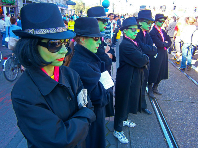 http://www.indymedia.nl/nl/2011/07/77125.shtml Het was een prachtige, zonnige dag in Amsterdam. We kwamen om 17.00 uur aan op de Dam: 7 'stille' leden van de speciale afdeling 'Inspector Green, Inspekteur Grün en Inspecteur Vert'. Onmiddelijk begonnen we met het maken van een paar rondes. Waarom? om onze collega's te vinden die zich misschien eenzaam in een enthousiaste menigte van krakers en sympathisanten bevinden. Het was beslist niet makkelijk... Waren ze de weg kwijtgeraakt? Waren ze verdwenen? Na het aanhoren van een paar heel interessante toespraken startte uiteindelijk de demonstratie. Met eindeloze energie keken en keken en keken we, maar wŕŕr waren verdorie onze geliefde collega's?! alleen in de staart van de demonstratie vonden we een paar kandidaten; we zorgden een tijdje voor gezelschap. De beste manier om je niet eenzaam te voelen als stille! Maar om eerlijk te zijn: we twijfelden nog steeds over de vraag - horen ze echt bij ons of horen ze bij hen? In het verleden was het zo makkelijk om stillen te herkennen, maar nu... Wij waren tenminste herkenbaar als stillen! En zo hoort het! Laten we het eens luid en duidelijk roepen: "Dit land heeft orde nodig!" E-Mail: rebelact@ddh.nl Website: http://www.rebelact.nl | | What was the point in your action? | anti-egoism - 04.07.2011 15:46