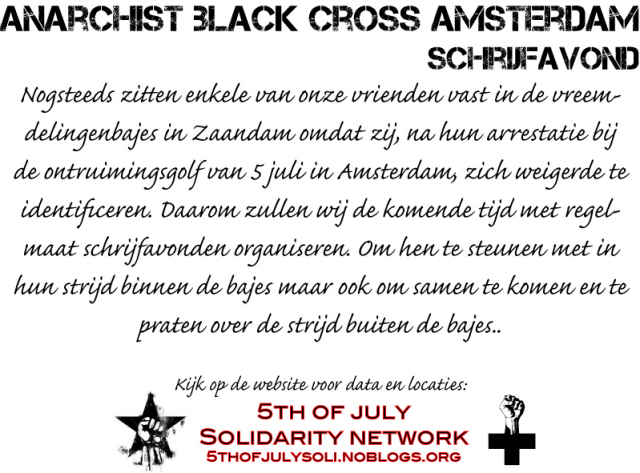 Zaterdag 6 augustus is er soepcafé en schrijfavond in de MKZ. We nodigen iedereen uit om mee te denken over, en mee te werken aan manieren om onze kameraden in de migrantengevangenis Zaandam te ondersteunen. Saturday August 6 there will be soupcafé and prisoner writing evening in the MKZ. Everybody is invited to come think about and work on ways to support our comerades who are still detained in the migrant prison Zaandam. 19:00 MKZ 1ste Schinkelstraat 14 Amsterdam Website: http://abcamsterdam.wordpress.com/ | |