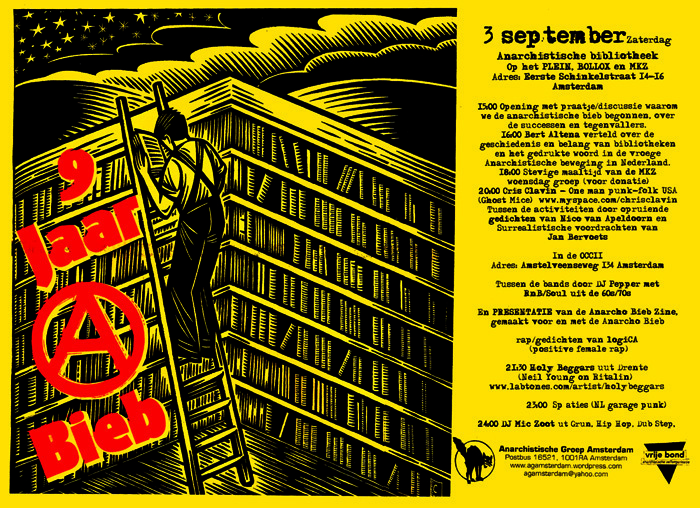 Morgen 3 september viert de AGA het 9 jarige bestaan van de Anarchistische bieb in De Bollox. Daarnaast bestaat de AGA ook al meer dan 10 jaar en dat hadden we nog niet gevierd. Kom dit met ons vieren in de Binnenpret.