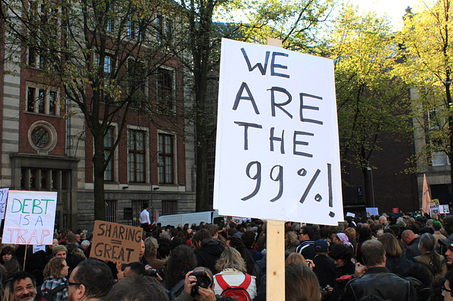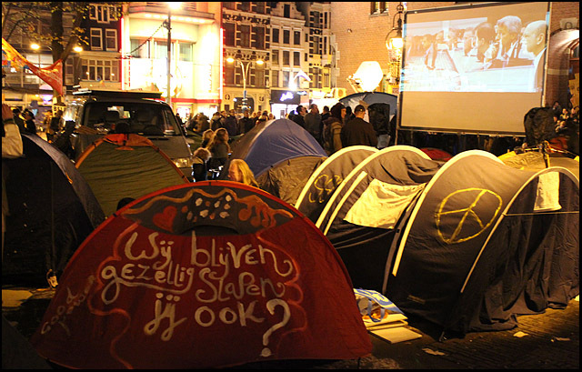 De bezetting op het Beursplein in Amsterdam is een succes! Bomvol mensen...