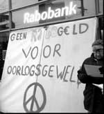 In meer dan 22 steden is er donderdag actiegevoerd tegen de levering en financiering van Nederlandse marine-schepen aan Indonesie.Nederland is een van die tien grootste wapen-exporteurs ter wereld. Uiteraard oogst dit veel kritiek van verschillende organisaties. Zij verzetten zich tegen de verkoop van wapens en wapenonderdelen aan landen die dit materiaal (kunnen) gebruiken voor mensenrechtenschendingen en oorlog. Alhoewel er wel een beleid is voor wapenverkoop komt het regelmatig voor dat deze onderdelen/wapens gebruikt worden bij conflicten. Read on... | Protest Rabobank te Leiden BabyEntei - 16.12.2004 16:32