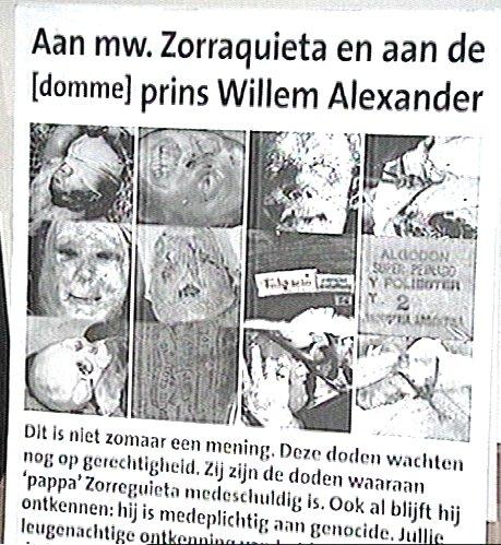 Treurig dat Daniel door 5 agenten moest worden weggevoerd. Mag hij ZIJN mening niet weergeven dan? Een mening gestaafd aan de hand van foto´s van aangespoelde Argentijnse lijken, van mensen die door het regime levend in zee zijn gedumpt. Heel zorgelijk dat Willem Alexander in de ontkenning blijft steken m.b.t. de rol van zijn schoonpapa. Alles wat vadertje Zorreguita vertelt, wordt voor zoete koek aangenomen. Het is onmogelijk en ondenkbaar dat Zorreguita, die dik bevriend was met de militairen, en minister was ten tijde van het regime geen enkel idee had over de talloze verdwijningen. Dat de man tegen WA vertelt dat er 3 mensen uit zijn omgeving die verdwenen waren weer waren opgedoken en dat hij dus geen enkel vermoeden had van grootschalige vermissingen is een misselijkmakende smoes. Je houdt toch je hart vast, dat zo’n stupide, monomaan denkende figuur in de toekomst koning wordt. Ach ja, en we mogen een kind de daden van de ouders niet aanrekenen natuurlijk, maar het is heel zorgelijk dat Maxima is opgevoed in een gezin dat de dictatuur steunde. Het kan er bij mij niet in, dat zij als kind, tiener en volwassene niet talloze uitspraken gehoord heeft uit haar kringen, (inclusief uit de mond van de legervriendjes van papa) die ronduit fascistisch waren. Dingen die je al vanaf kind met de paplepel krijgt ingegoten maak je je ongewild ook eigen. Zoals de ouden zongen… Het is ten hemelschreiend dat de koningin al maanden voor de verloving al deze foute familie had uitgenodigd ten paleize en op haar jacht. Zo moeder zo zoon. Totaal onverschillig ten opzichte van zo’n gruwelijke zaak als de verdwijning van tienduizenden mensen. Die Oranjes varen zonder op of om te zien, hun koers en houden met niets en niemand rekening. Dat er genoeg mensen uit “het volk” zijn die daar grote problemen mee hebben, interesseert ze geen biet. Daarbij, ik zie niet in waarom mensen niet hun ongezouten mening mogen geven over het Koningshuis. Het is toch net zo goed EEN MENING, ONZE MENING! Leven we niet meer in een democratie dan? Word ons de mond gesnoerd als we kritische geluiden laten horen over het koningshuis? Het koningshuis is een grote nietsbetekenende poppenkast waar nodeloos veel geld wordt uitgegeven aan onnodige franje. Als die Oranjes zelf voor die onzin zouden moeten betalen, (en ze hebben ‘t geld ervoor), dan was ‘t koningshuis allang opgeheven, want ze strijken alleen maar grote sommen gemeenschapsgeld, belastingvrij nog wel, op maar zorgen er wel voor dat ‘t onderhoud van ‘t koningshuis niet wordt betaald uit het eigen vermogen. Terzijde nog het volgende: het is een grof schandaal dat er ALWEER zoveel gemeenschapsgeld is gestoken in het huwelijk, dat op zich niet anders is dan een privé-feestje van de jet set en dat een groot deel van de binnenstad en gebieden waar de gasten logeerden dagenlang zijn afgezet. De koninklijke familie is puissant rijk en hebben genoeg paleizen om hun privéfeesten te vieren, en ‘t geeft geen pas dat 50% van de kosten van dit huwelijk ten laste komen van de gemeenschap.
