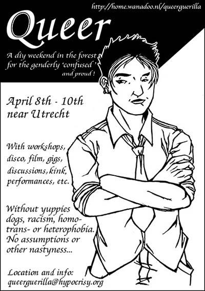 Van 8 tot 10 april organiseert Queer Guerilla samen met andere queers een weekend voor homo-, bi-, hetero-, a-, trans- en ander sexuelen, poly-, mono- of anders gaam, man, vrouw en alles ertussenin. Op het programma staan workshops, discussies en films rond gender, seks(ualiteit), (anarcho) feminisme en zo meer. Bovendien disco (met DJ Siren en DJ Freak), optredens van Elvis & the Burger Kings (eindelijk uit de kast) en Elle Bandita (lo-fi queergrrl elektropunk) plus een speciale queer diabolo show. Als je zelf nog iets wilt toevoegen wordt dat erg gewaardeerd (laat het het liefst wel even van tevoren weten)!  Onder voorbehoud en onder andere de volgende workshops: queer gezin en opvoeding; safe sex; gender, seksualiteit en religie; theater; homobeweging in de derde wereld; homofobie/homo voorlichting op scholen; buikdansen; massage; seksuele diversiteit en de ontwikkeling van de consumptiemaatschappij; relatievormen; SM; drag king… en ruimte voor allerlei discussies Rolstoelvriendelijk, kinderen welkom, honden niet. Meld je aan op queerguerilla@hypocrisy.org, dan krijg je ook de locatie en meer info. From April 8 till 10 Queer Guerilla and other queers organize a weekend for homo-, bi-, hetero-, a-, trans- and other sexuals, poly-, mono- or other gamous, male, female and anything in between. The program includes workshops, discussions and films about gender, sex(uality), (anarcho)feminism and so on. Moreover there’s disco, performances of Elvis & the Burger Kings (finally coming out) and Elle Bandita (lo-fi queergrrl elektropunk) plus a special queer diabolo show. If you want to add something yourself it will be appreciated a lot (please let us know beforehand)! Under reservation there are, among others, the following workshops: queer family & upbringing; safe sex; gender, sexuality and religion; theatre; gay-movement in the third world; homophobia/homoeducation at schools; bellydancing; massage; bdsm; drag king… Wheelchair-friendly, children welcome, no dogs. Apply at queerguerilla@hypocrisy & get the location & more info. E-Mail: queerguerilla@hypocrisy.org Website: http://home.wanadoo.nl/queerguerilla |