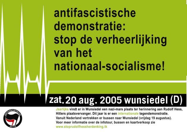Ja, laten we ook de beulen van Auschwitz herdenken voor hun geweldige inspanning in de oorlog... Fascisten herdenken valt mijns inziens niet onder vrijheid van meningsuiting. Het is juist een aantasting ervan en bovendien diep beledigend voor alle overlevenden van de Holocaust. Vrijheid van meningsuiting wordt te pas en te onpas gebruikt. De een mag alles, de ander moet op zijn woorden letten. En soms lijkt het wel alsof nazi's gewoon aanspraak kunnen maken op een plek in de samenleving... TOEN NIET, NU NIET, NOOIT! Website: http://www.afvn.nl | | middenpagina | // - 08.07.2005 13:52