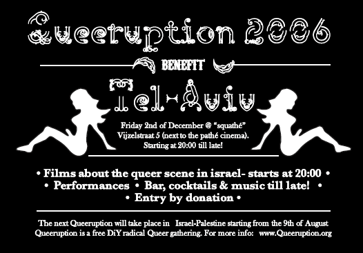 Queeruption tel-aviv 2006 benefit! Friday 2nd of december @ "squathe" vijezel straat 5 amsterdam (next to the pathe cinema). Starting at 20:00pm - til Late!!! *Films about the queer scene in israel- starting from 20:00 *Performances *Bar,cocktails& music till late! Free donation Bring your friends & put your dancing shoes on!!  QUEERUPTION is a free DiY radical queer gathering that has so far happened in London, New York, San Francisco, Berlin, Amsterdam, Sydney and Barcelona. Every Queeruption is a little different from the last one, shaped by the people who plan it, the community that makes it happen. The next queeruption will take place in israel-palestine, starting from the 9th of augost 2006. It is the first time that Queeruption takes place outside the borders of rich western states. This Queeruption will also extend beyond the centralized location in Tel-Aviv to the West Bank and spice up the World Pride parade in Jerusalem. There are also possibilities for people interested in staying longer to join solidarity work in the area which we will provide links to. A group will be in Tel-Aviv sometime before the event in order to help set things up. *Queeruption is a do-it-yourself, anti-commercial, non-hierarchal, safe and open space for workshops, music, art, actions, parties, sex, performances and everything you propose and/or prepare. Queeruption welcomes and celebrates all gender identities and sexualities, with no toleration to sexism, macho behavior, racism, heterophobia, lesbophobia, homophobia, transphobia, discrimination based on different abilities or ages, and any form of aggression. for more info: www.queeruption.org |
