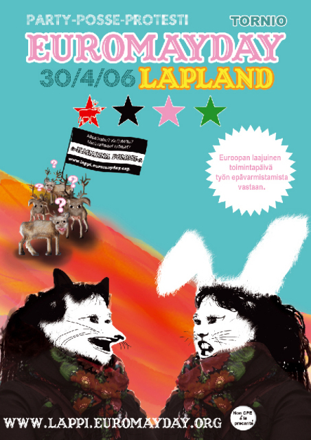 check het op http://www.kemi.fi/kipina/euromayday/ LUE ILMIANNOT Huhtikuussa 30.4 järjestetään TORNIOSSA EuroMayDay-paraati, joka on osa euroopanlaajuista protestia ihmisten työolojen epävarmistamista vastaan. Vuonna 2004 EuroMayDay kokosi Milanon ja Barcelonan kaduille 100.000 ihmistä ja lanseerasi Euroopassa käsitteen prekariaatti kuvaamaan nousevaa yhteiskunnallista toimijaa. Viime vuonna tapahtuma levisi 15 kaupunkiin ympäri Eurooppaa, myös Suomeen. Helsingin MayDay oli suurin radikaali mielenosoitus vuosiin. Tänä vuonna myös me Lapissa otamme uuden poliittisen juhlan haltuumme. Työntekijöiden oikeuksien on toteuduttava myös alati epävarmistuneemmassa yhteiskunnassa. Vanhalla sukupolvella ei ole enää yksinoikeutta vappuun, vaan siitä on tulossa myös epävarmoissa työoloissa työskentelevien eli prekariaatin tapahtuma, jolla on jälleen halu vaatia asioita. Euromayday-juliste paino Euromayday-flyeri paino Ilmianto-tarra paino | |